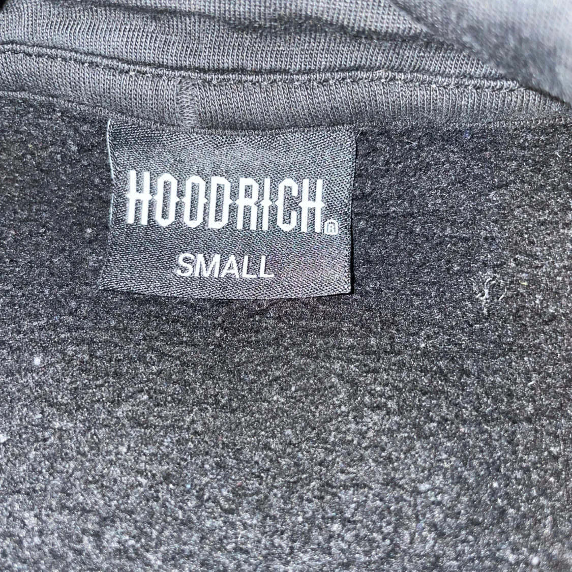 Säljer en svart hoodie från Hoodrich med röd text på framsidan. Den har en klassisk design med huva och långa ärmar. Perfekt för en avslappnad stil. Den har inga hål men texten börjar försvinna lite den saknar också sitt snöre till luvan