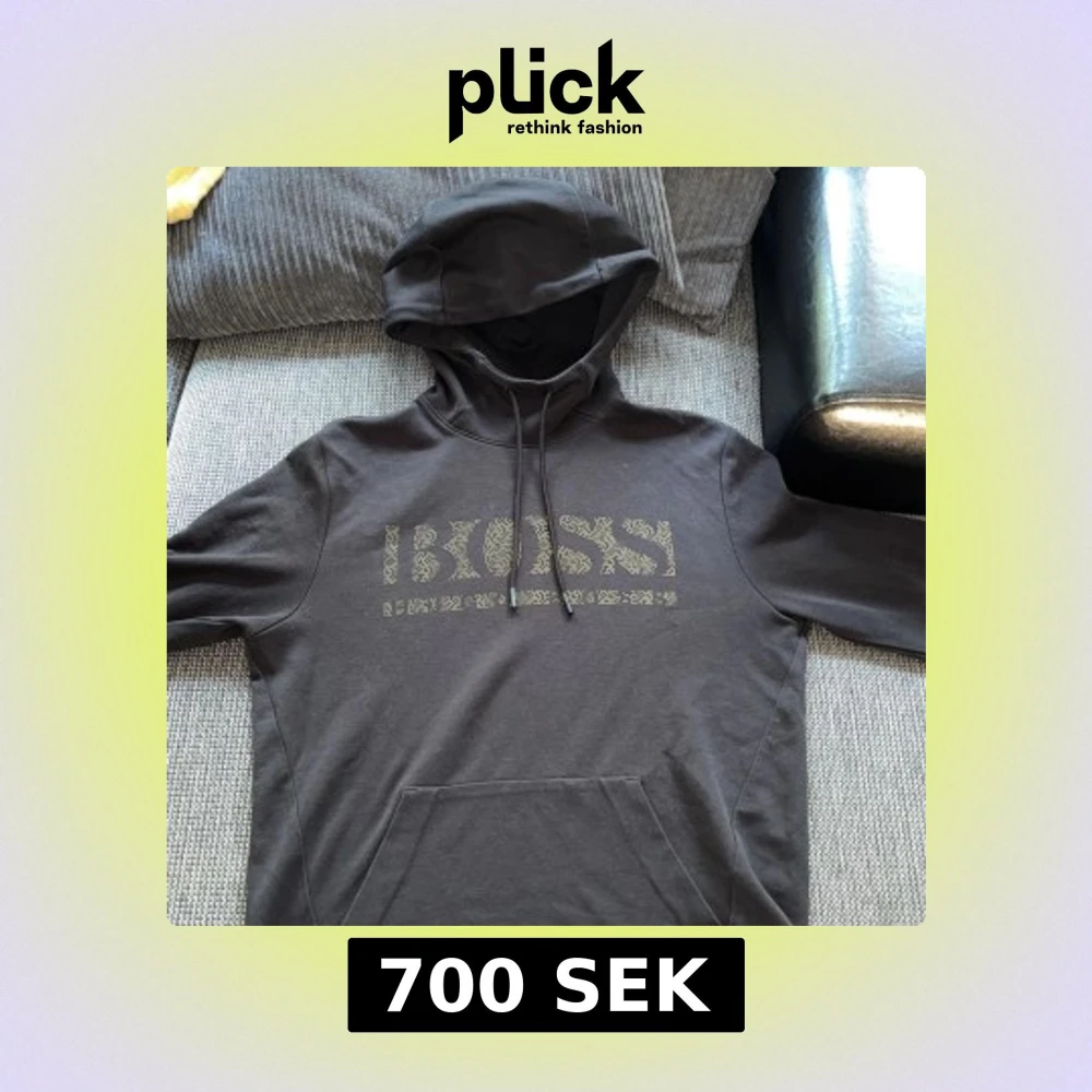 Svart hoodie från Hugo Boss i storlek S. Tröjan har en stor BOSS-logga framtill i ett diskret mönster, klassisk huva med snörning och en stor magficka. Perfekt för dig som gillar stilrena och bekväma plagg med premiumkänsla.