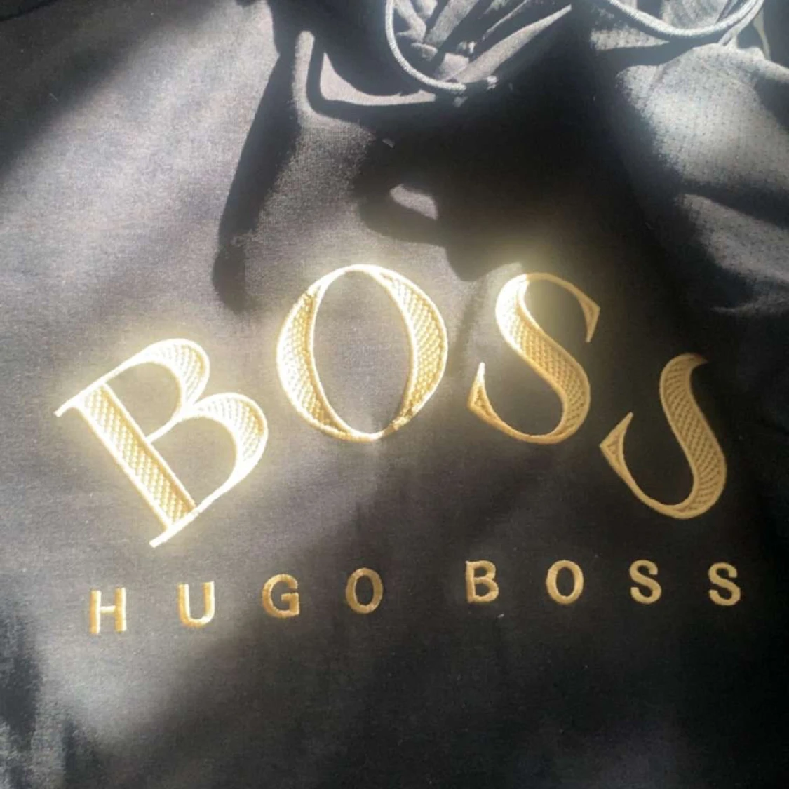 Svart hoodie från Hugo Boss med stort BOSS-tryck i guld på bröstet. Klassisk huva med snörning och långa ärmar. Mjuk bomullskänsla och ribbade muddar. Perfekt för dig som gillar stilrena streetwear-plagg med exklusiv känsla.