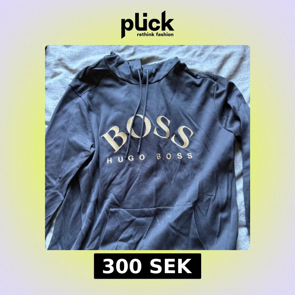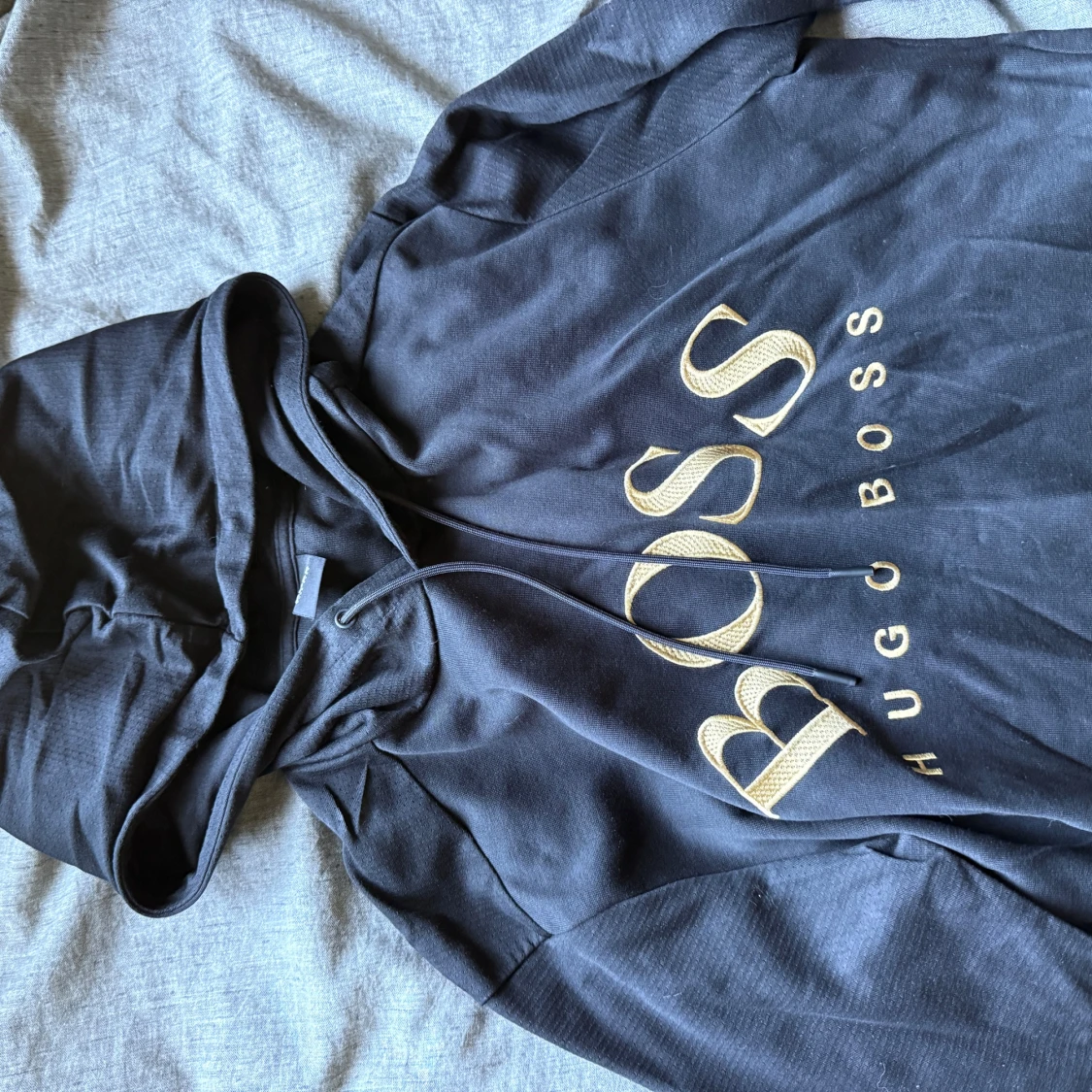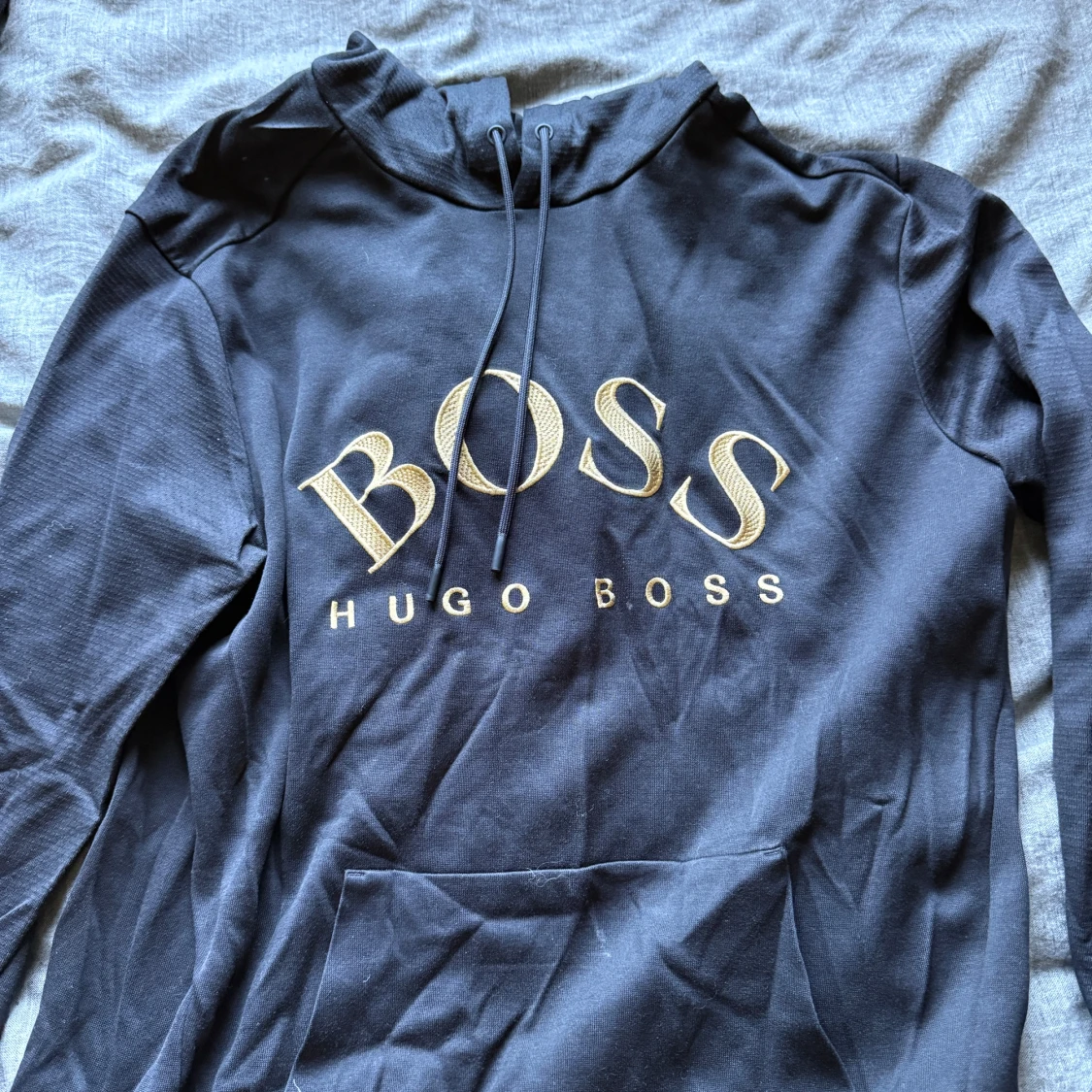 Svart hoodie från Hugo Boss med stort BOSS-tryck i guld på bröstet och matchande HUGO BOSS-text under. Tröjan har huva med snörning och en klassisk magficka. Mjuk bomullskänsla och långärmad modell, perfekt för chill dagar.