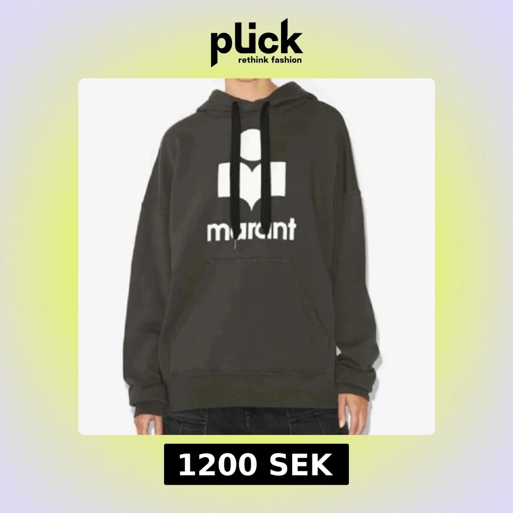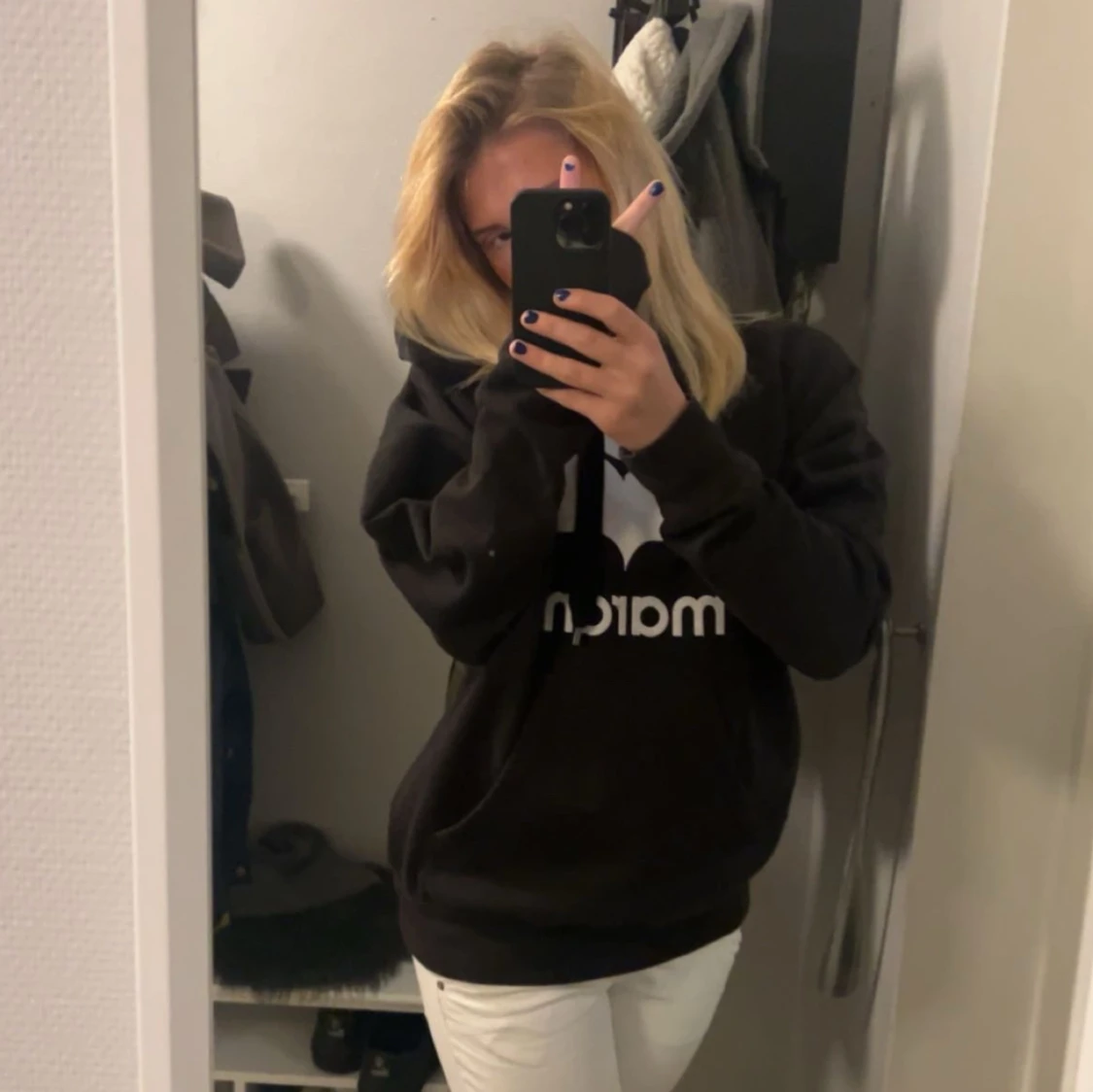 Säljer en svart hoodie från Isabel Marant med stor vit logga framtill. Hoodien har huva med svarta snören, stor magficka och en loose passform. Perfekt för dig som gillar streetstyle och vill ha något bekvämt och snyggt.