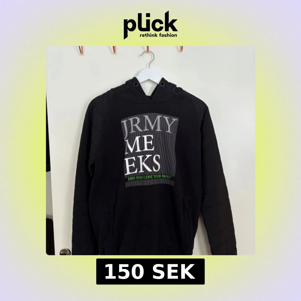 Säljer en svart hoodie med tryck i vitt och grönt framtill. Hoodien har en klassisk design med långa ärmar och en bekväm passform. Perfekt för en avslappnad stil.