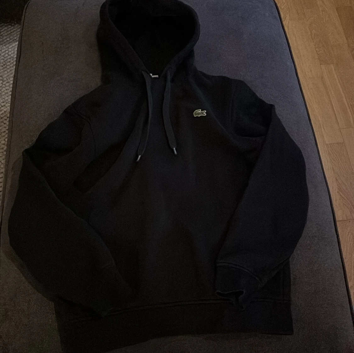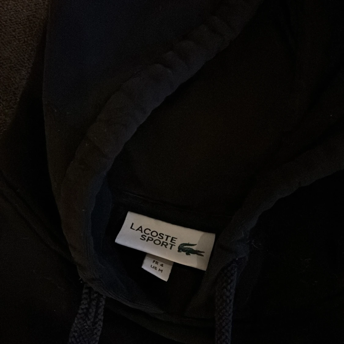 Säljer en stilren svart hoodie från Lacoste Sport. Den har en klassisk design med dragsko i huvan och den ikoniska krokodilloggan på bröstet. Perfekt för en avslappnad look.