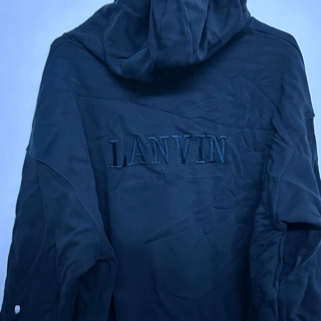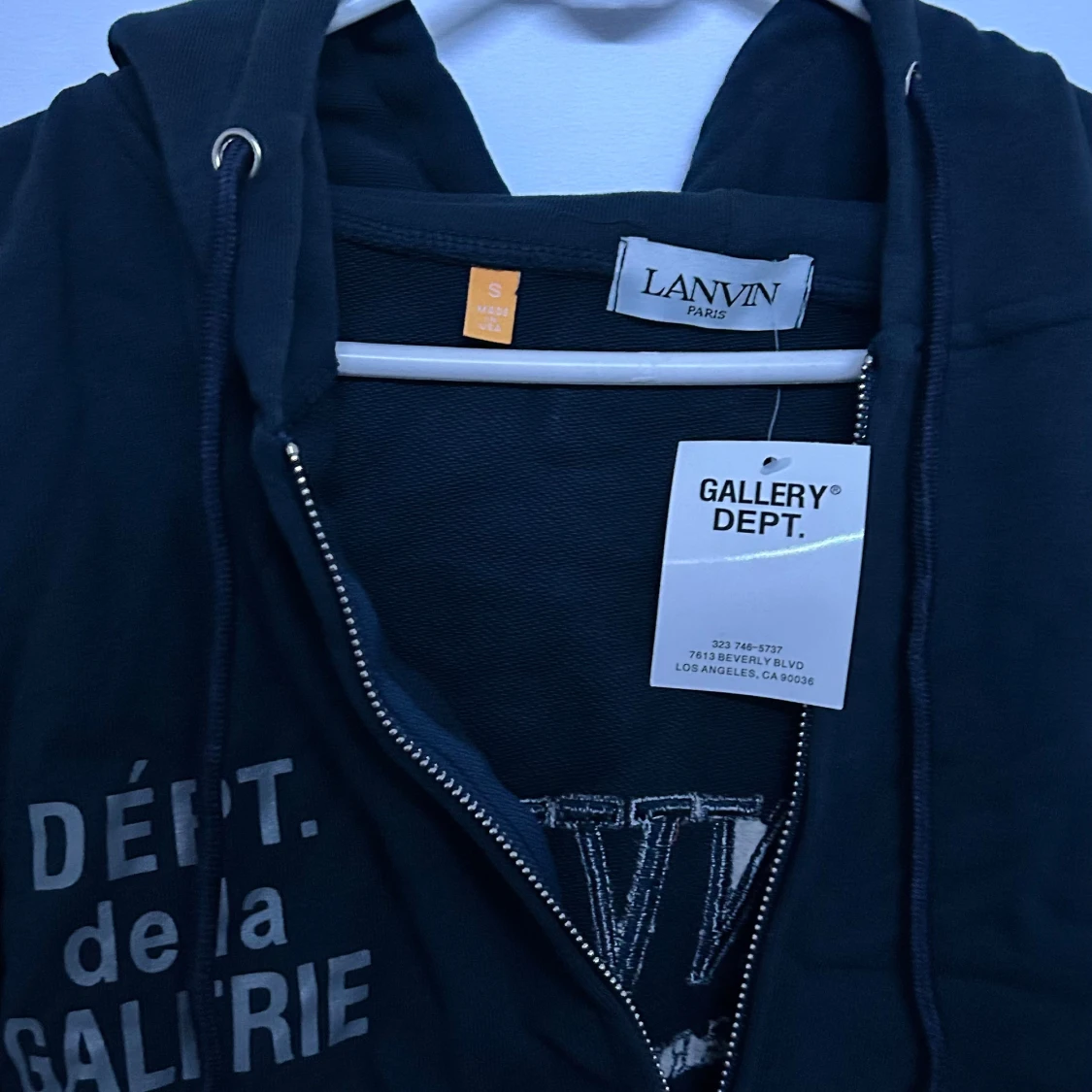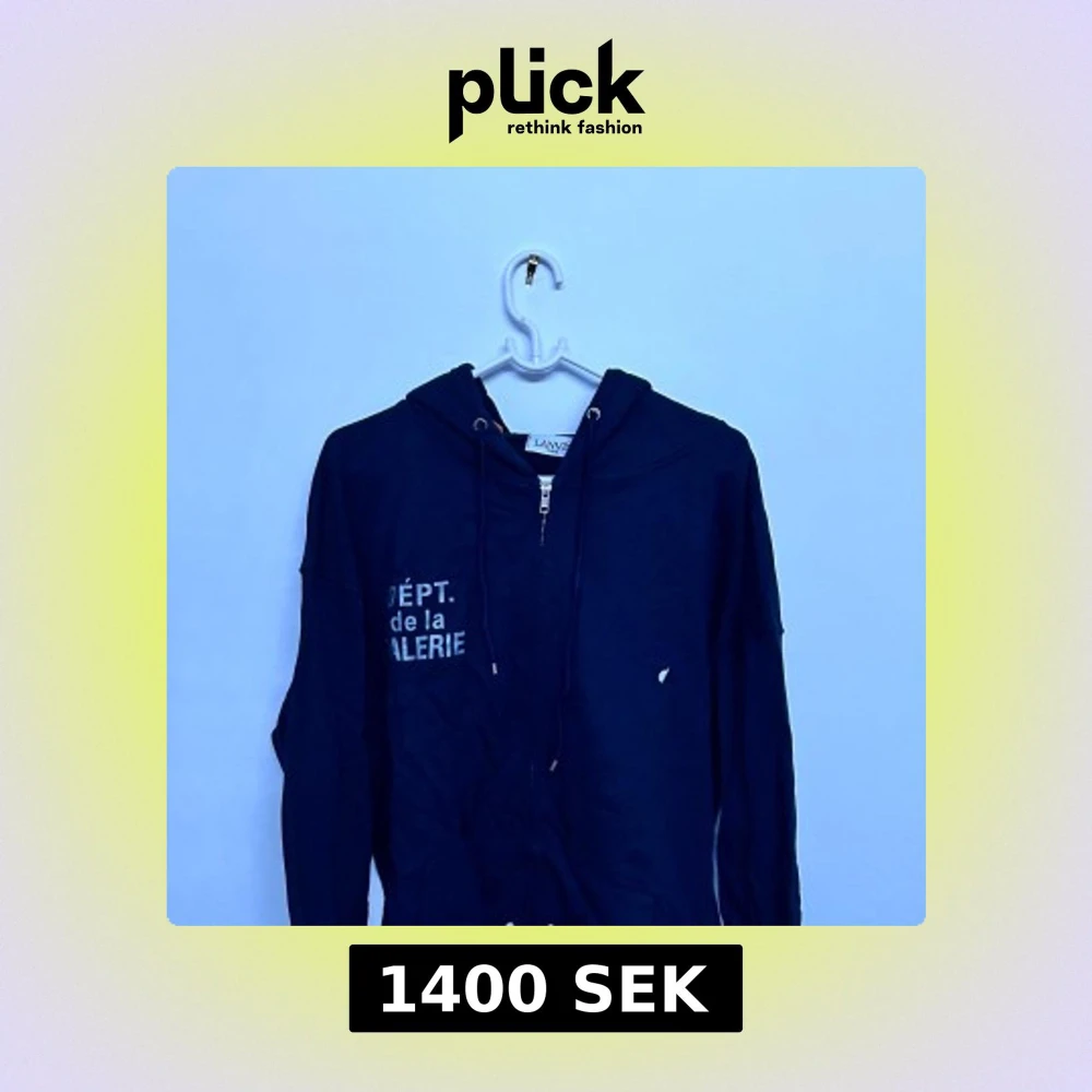 Säljer en svart hoodie från Lanvin i samarbete med Gallery Dept. Tröjan har dragkedja, huva med snörning och tryck både fram och bak. Tillverkad i 100% bomull och har en avslappnad passform. Perfekt för dig som gillar streetwear.