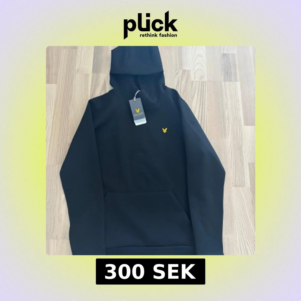 Säljer en svart hoodie från Lyle & Scott med klassisk gul logga på bröstet. Tröjan har huva med dragsko och en stor magficka framtill. Perfekt för en avslappnad stil. Helt ny