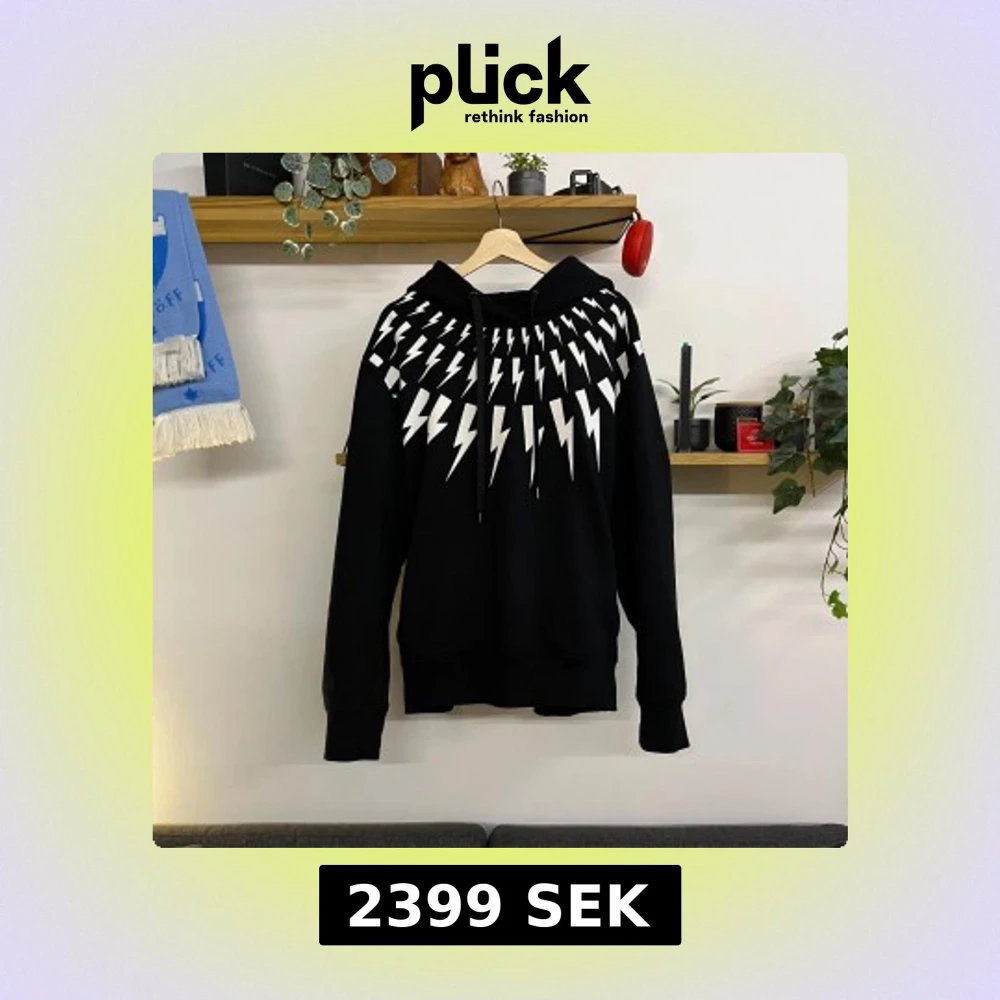 Snygg svart hoodie från Neil Barrett med ett iögonfallande vitt blixtmönster runt halsen och över axlarna. Perfekt för en cool och avslappnad stil. Hoodien har en klassisk passform med långa ärmar och justerbar huva. Köpt för ca 6 000 kr, KVITTO FINNS