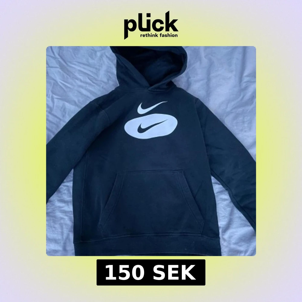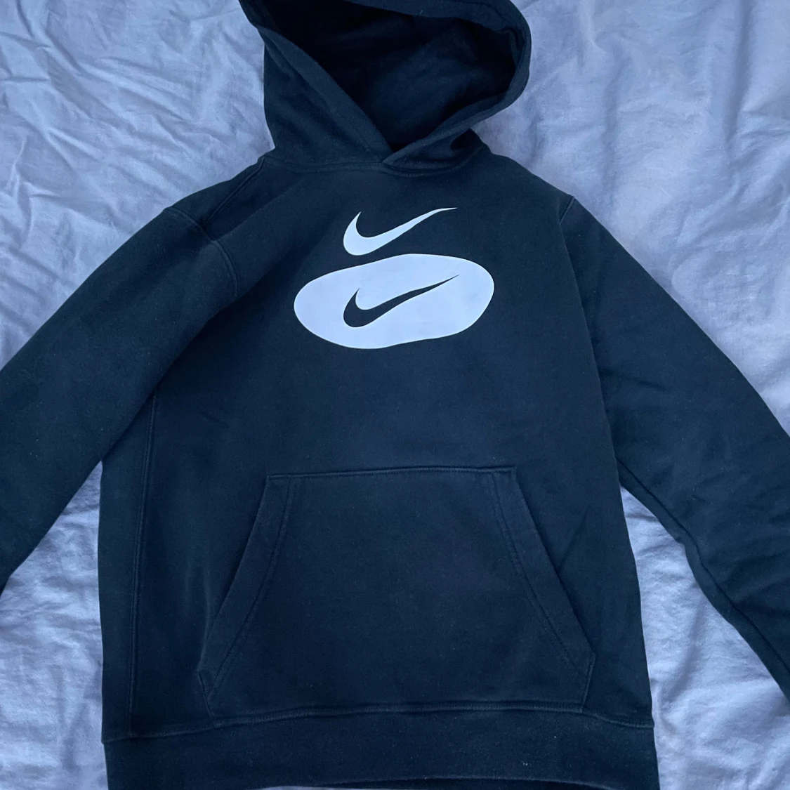 Säljer en svart hoodie från Nike med en stor vit logga på framsidan. Tröjan har en klassisk känguruficka och en bekväm huva. Perfekt för en avslappnad stil. Passar nån som är mellan 165-170 storlek xs