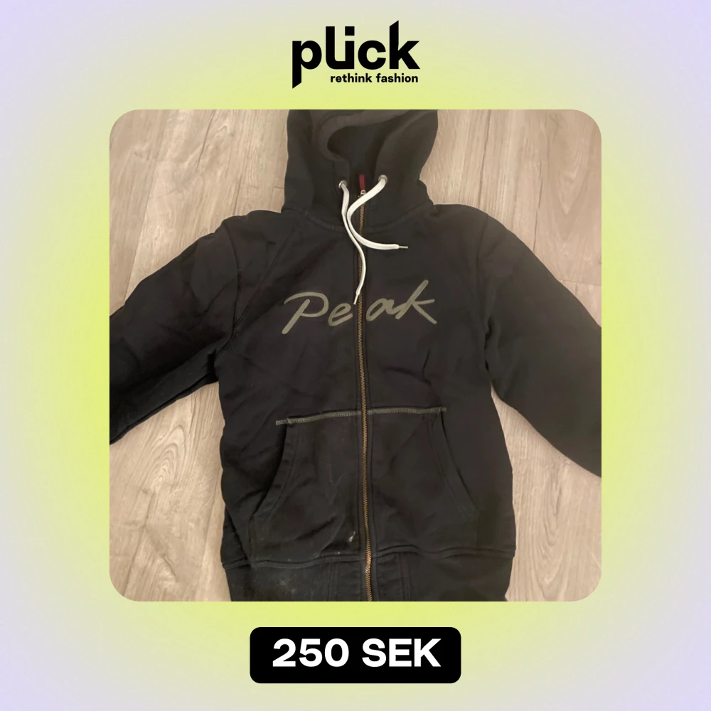 Säljer en svart hoodie från Peak Performance med dragkedja och justerbar huva. Perfekt för kyliga dagar med sin bekväma passform och praktiska fickor framtill.