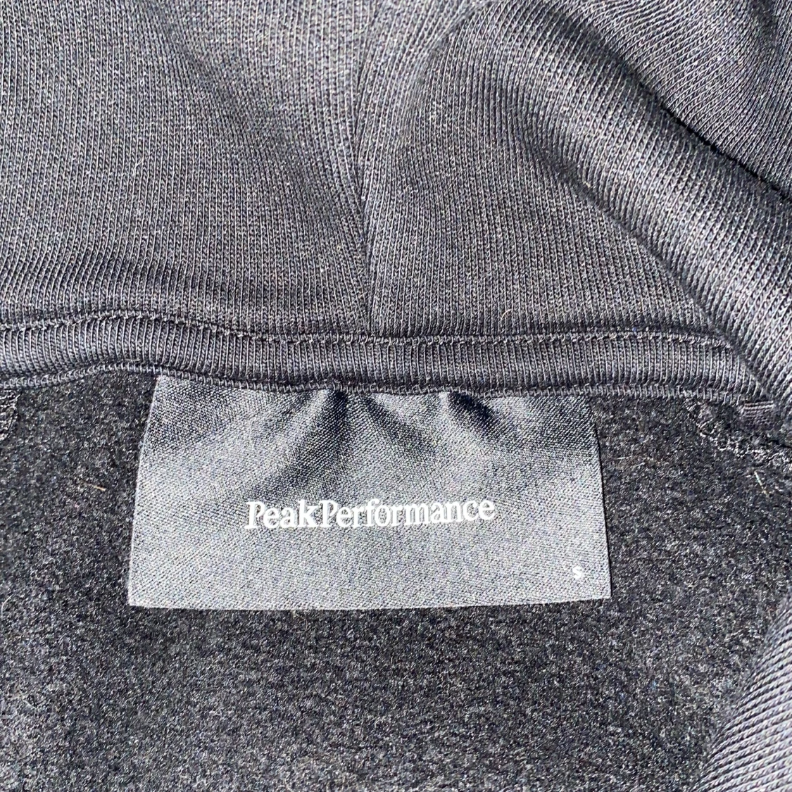 Svart hoodie från Peak Performance med vit logga på bröstet. Klassisk modell med huva, snörning och stor magficka framtill. Mjuk insida och ribbade muddar vid ärmslut och nederkant. Perfekt för chill eller träning.