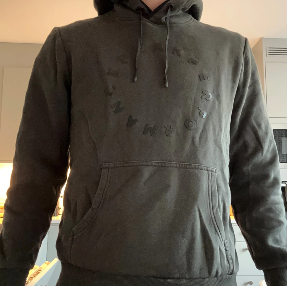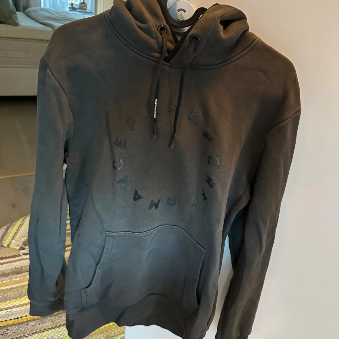Säljer en svart hoodie från Peak Performance med diskret logga i cirkel på bröstet. Tröjan har huva med snörning och en stor magficka. Perfekt för dig som gillar en clean och stilren look.