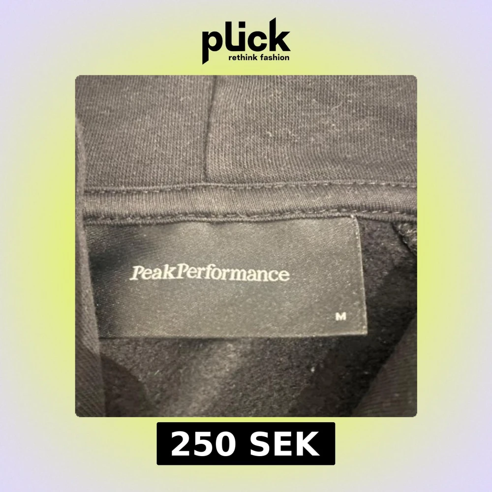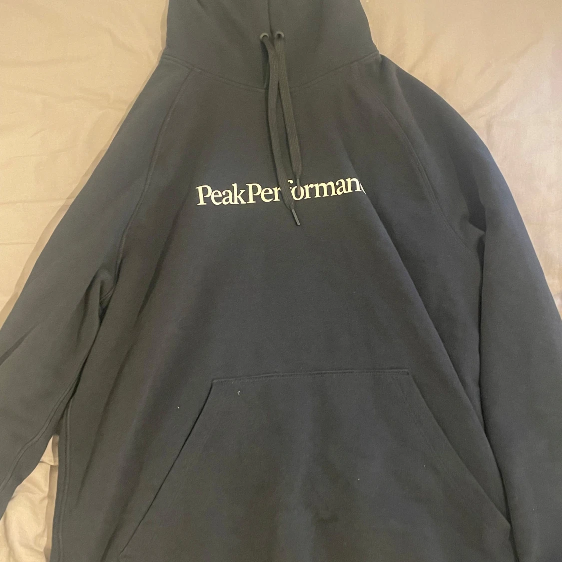Svart hoodie från Peak Performance i storlek M. Klassisk modell med huva och snörning, stor magficka framtill och vit logga över bröstet. Perfekt för chill dagar eller när du vill ha en clean och enkel stil.