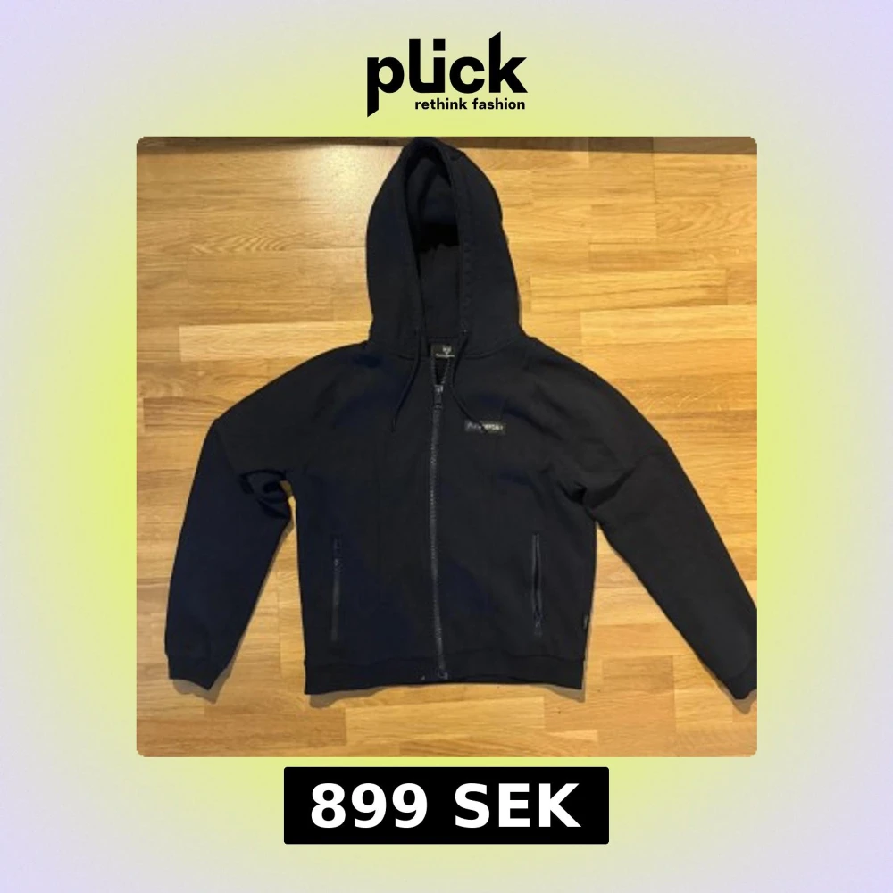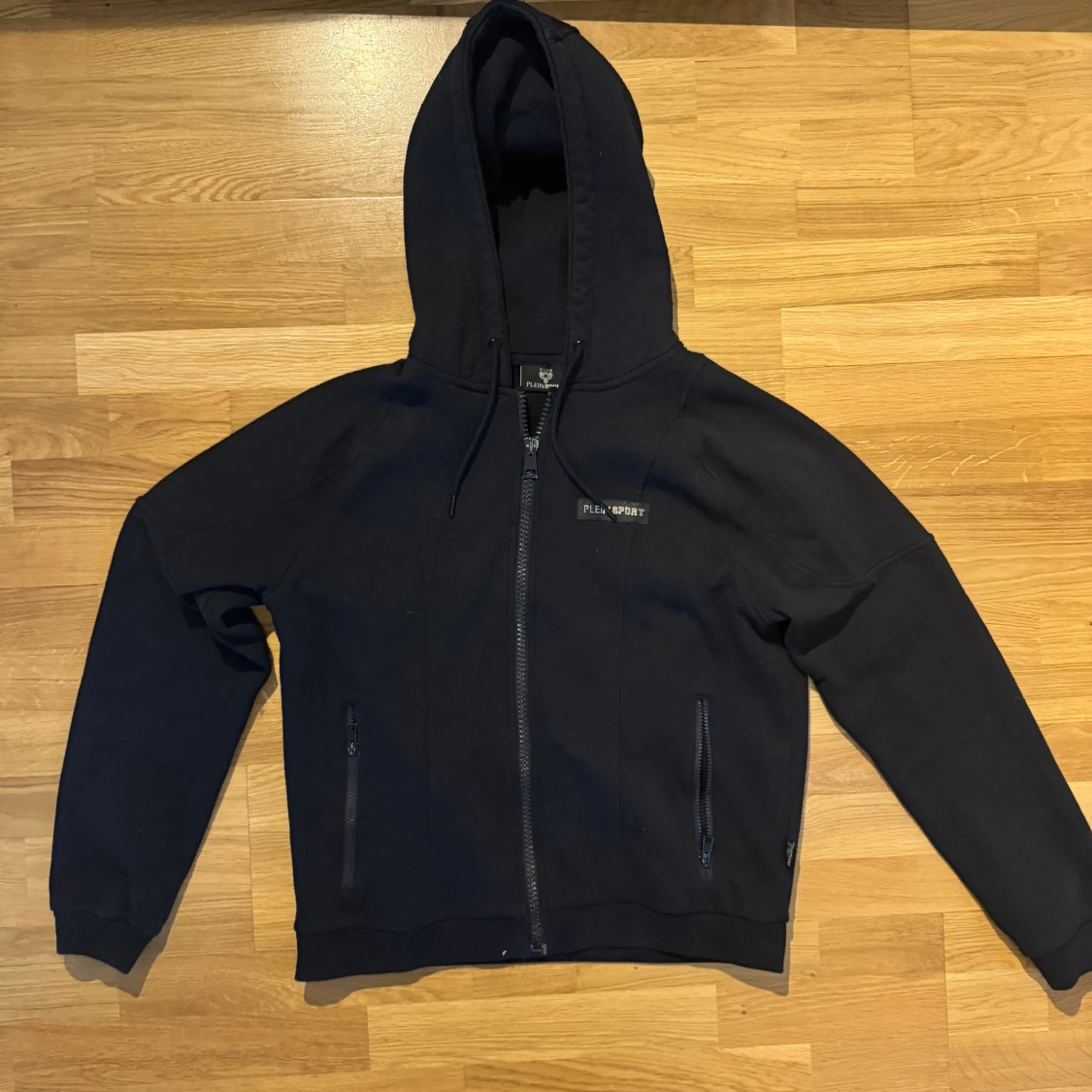 Svart hoodie från Plein Sport med huva och snörning, hel dragkedja och två fickor med zip. På ryggen finns ett stort gult tigertryck och logga. Materialet är mjuk bomull och passformen är normal. Perfekt för dig som gillar sportig streetstyle.