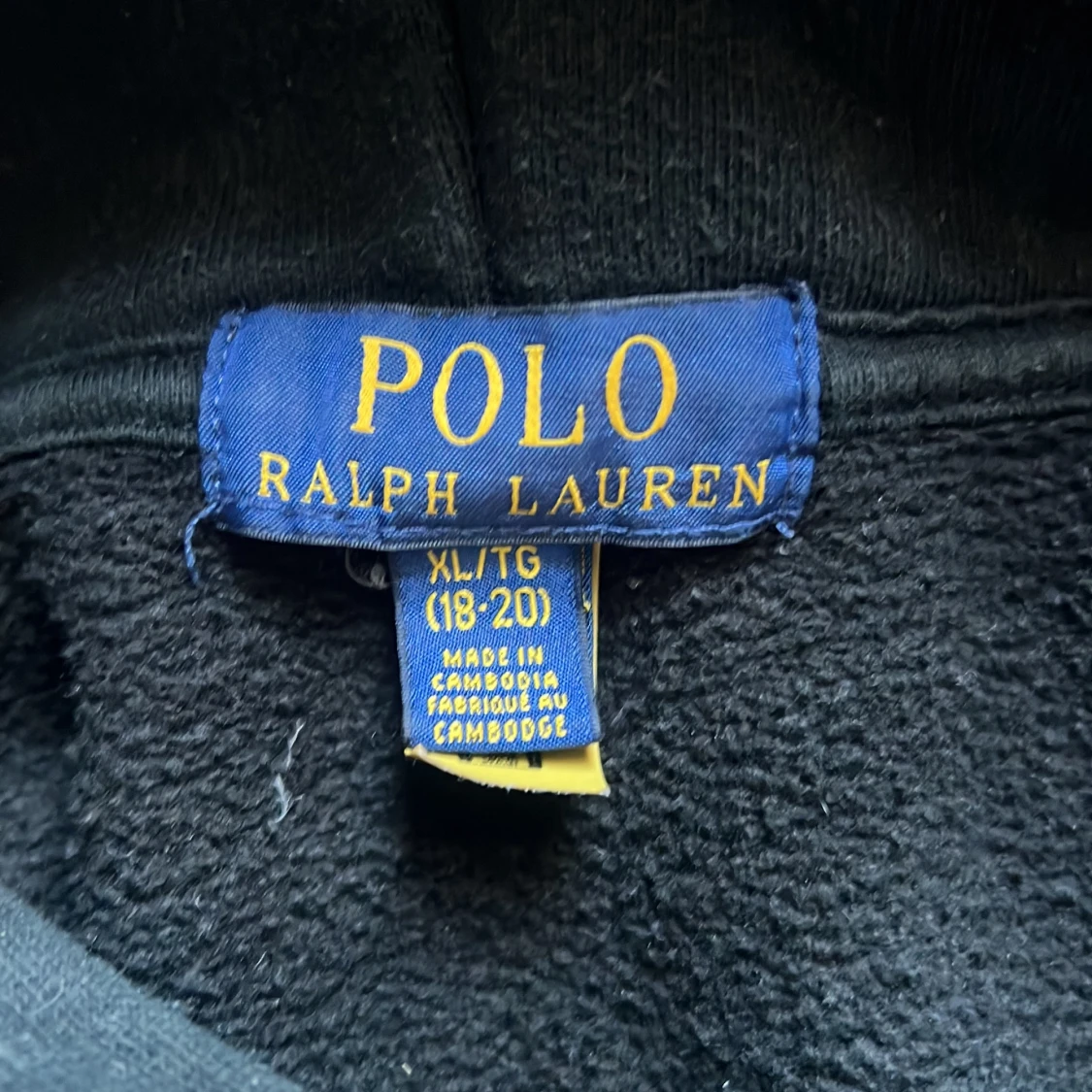 Svart hoodie från Polo Ralph Lauren med klassisk röd broderad logga på bröstet. Tröjan har huva, känguruficka och långa ärmar. Tillverkad i mjuk bomull och har en normal passform. Det står XL på insidan men den passar XS/S.
