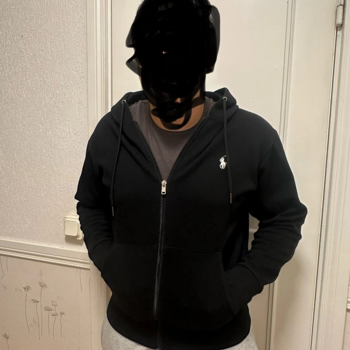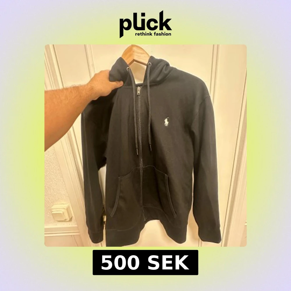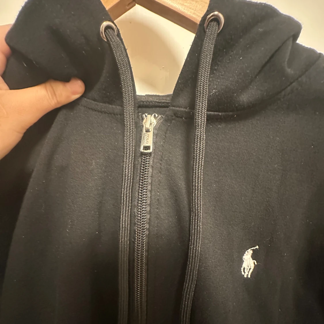 Svart hoodie från Polo Ralph Lauren med klassisk vit logga på bröstet. Tröjan har dragkedja, huva med snörning och två stora fickor framtill. Tillverkad i mjuk bomull, perfekt för chill dagar. Snygg och enkel design som funkar till det mesta. Storlek S, skick bedöms enligt bilder