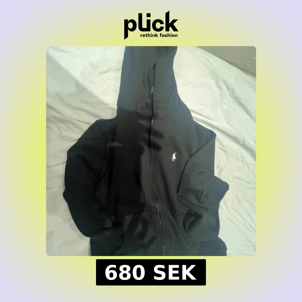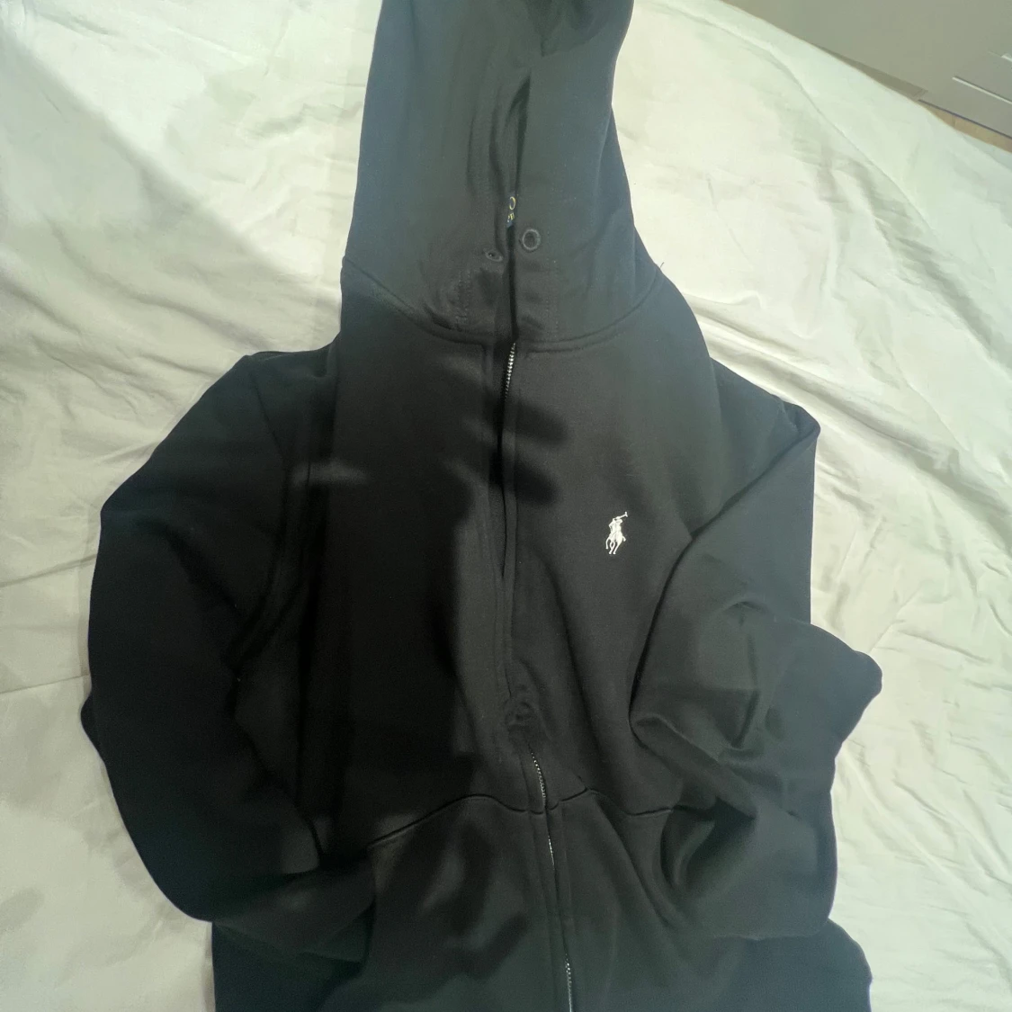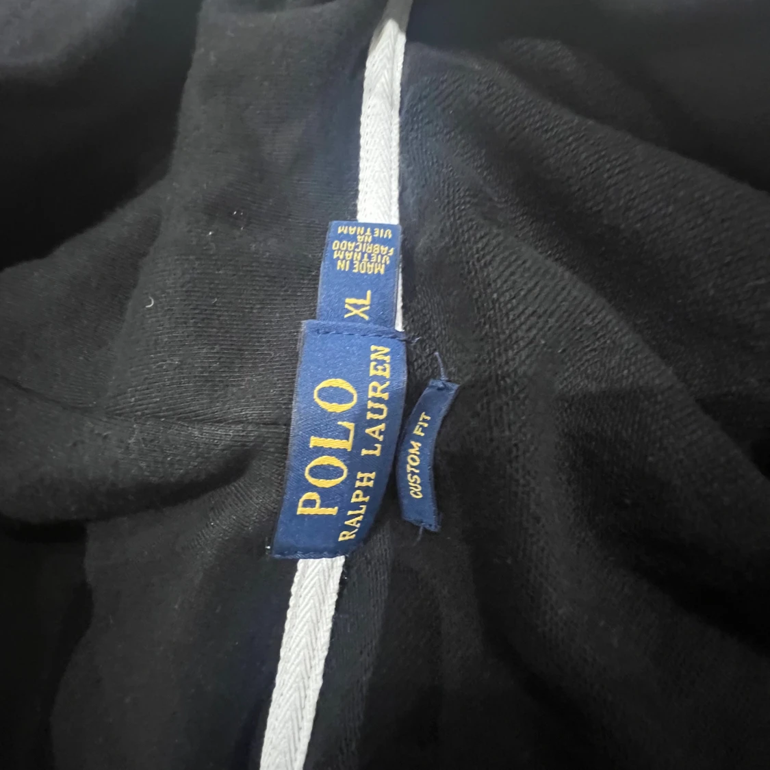 Svart hoodie från Polo Ralph Lauren i storlek XL. Klassisk design med vit broderad logga på bröstet, dragkedja framtill och huva. Tillverkad i mjuk bomullsmix som är skön att bära. Perfekt för en chill och stilren look. För fet men har du storlek L eller M kommer den också passa för den är stresch osv