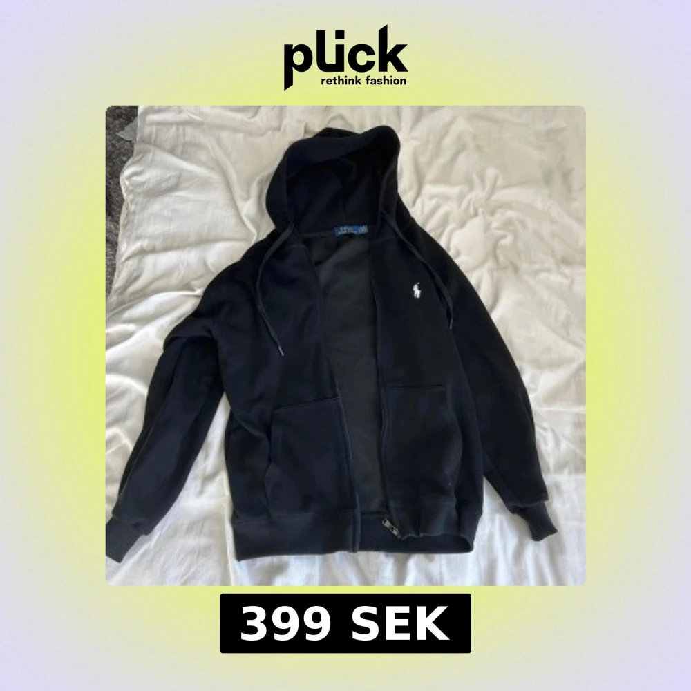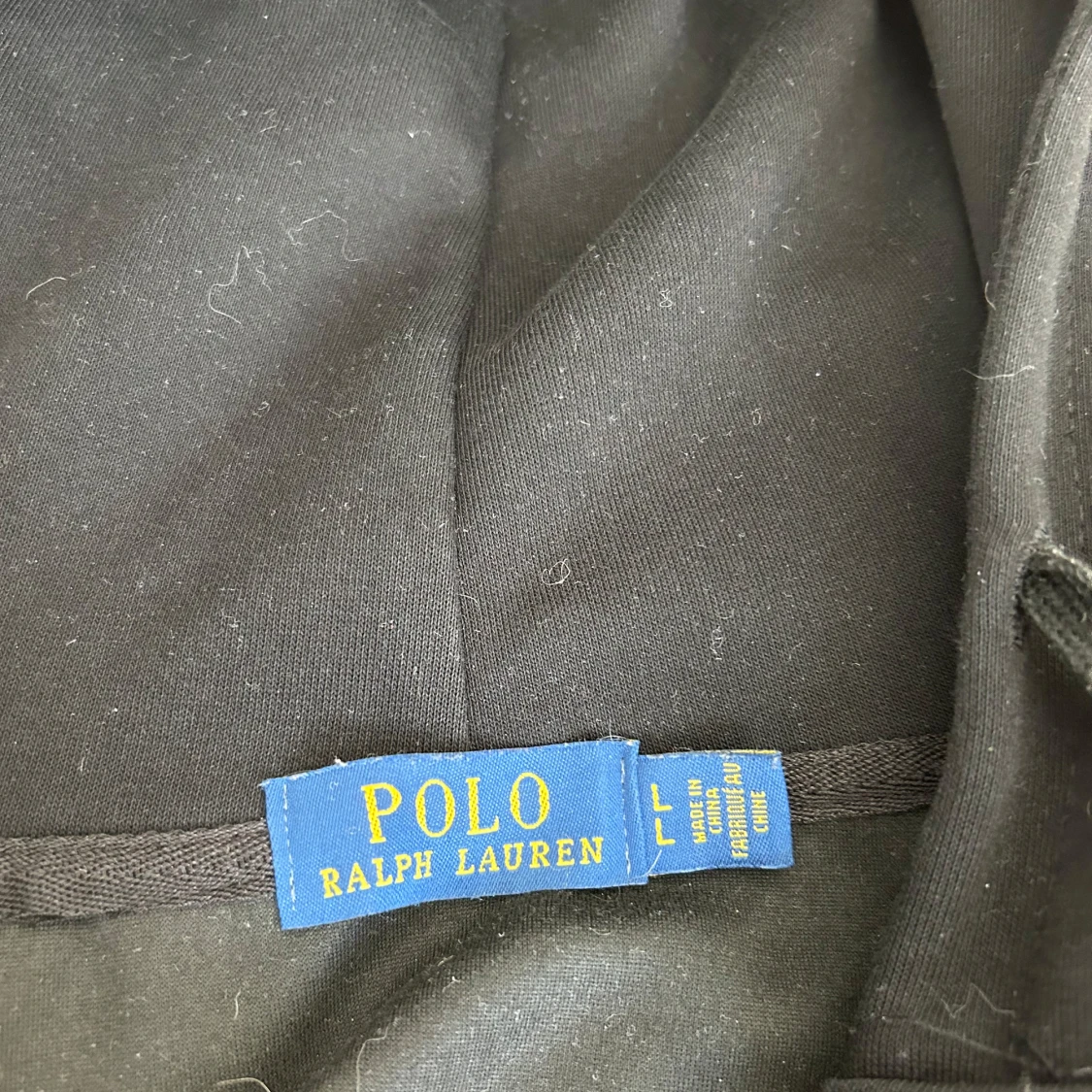 Svart hoodie från Polo Ralph Lauren med dragkedja och huva. Klassisk design med vit broderad logga på bröstet, två fickor framtill och ribbade muddar. Perfekt för en chill och stilren look. Storlek L men sitter som S/M.