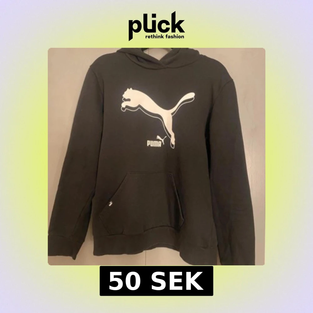 Säljer en svart hoodie från Puma med det klassiska logotyptrycket i vitt på framsidan. Tröjan har en stor ficka framtill och en bekväm huva. Perfekt för en avslappnad stil.