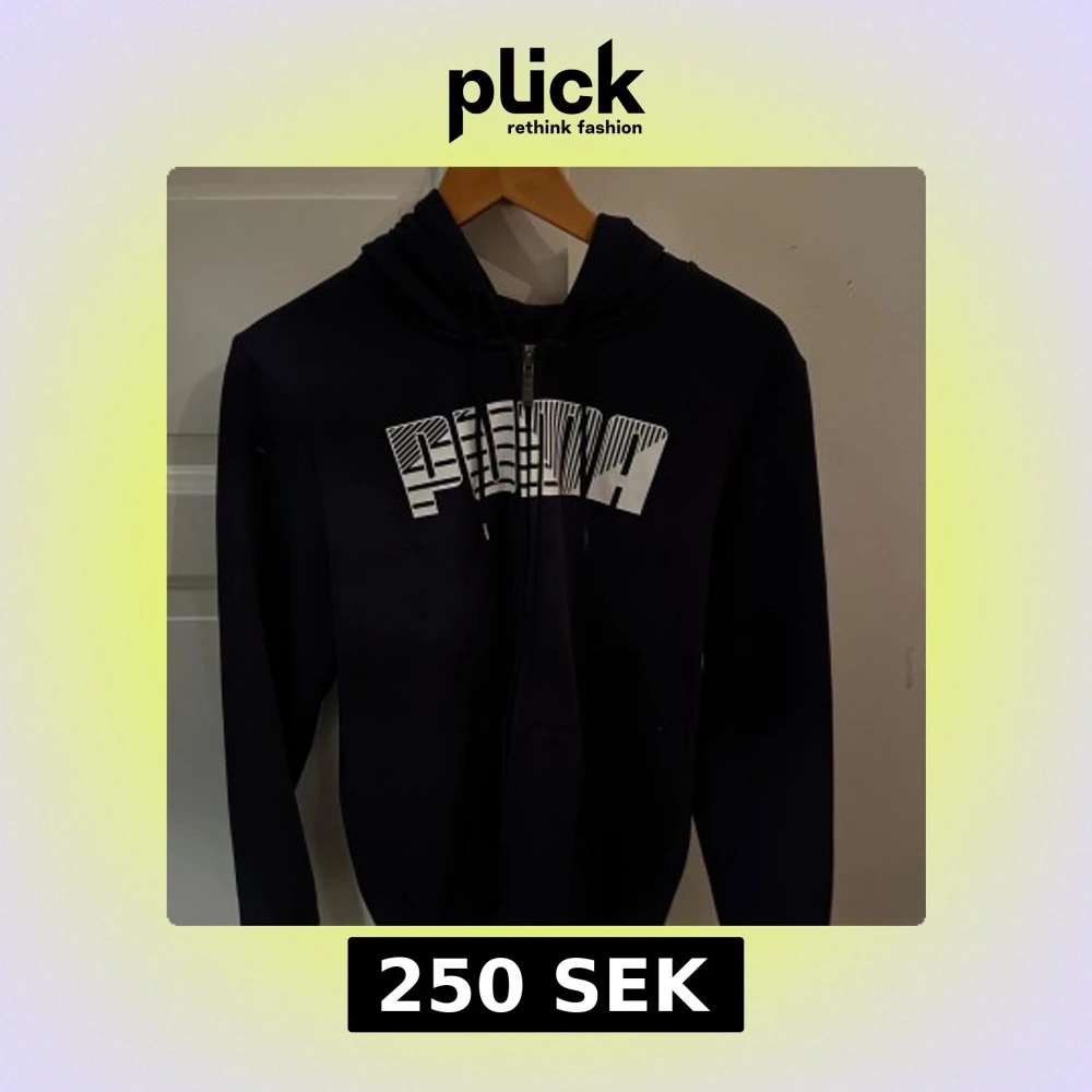 Säljer en svart hoodie från Puma med dragkedja och stor vit logga på framsidan. Perfekt för en avslappnad stil. Den har en bekväm huva med snörning och långa ärmar.
