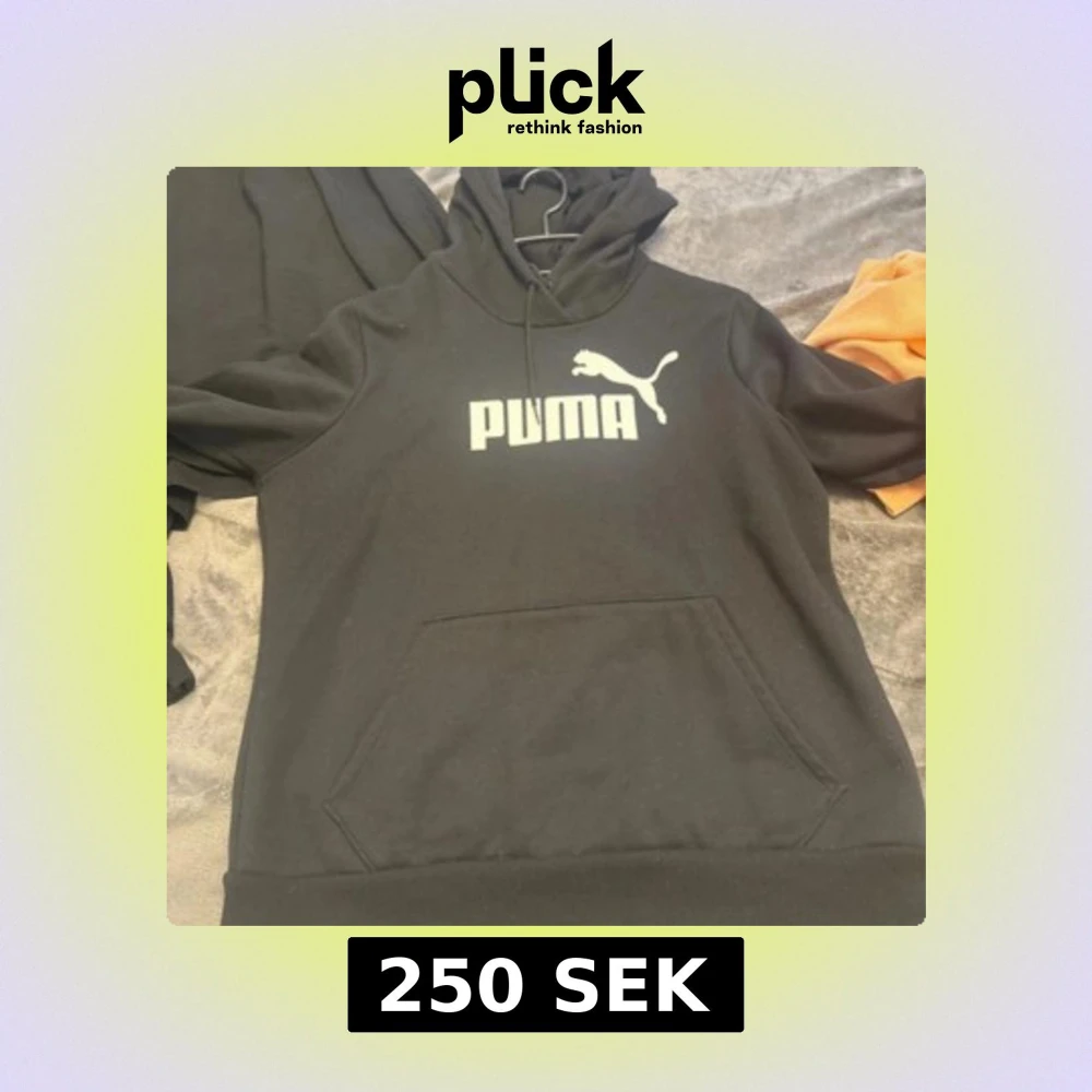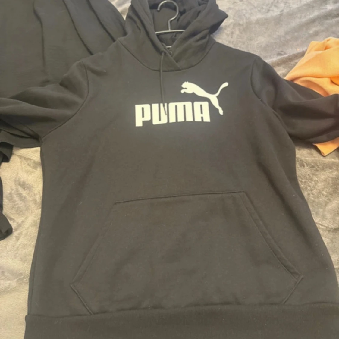 Svart hoodie från Puma med stor vit logga framtill. Klassisk känguruficka, huva med snörning och mjukt material som känns skönt mot huden. Perfekt för en avslappnad och sportig stil.