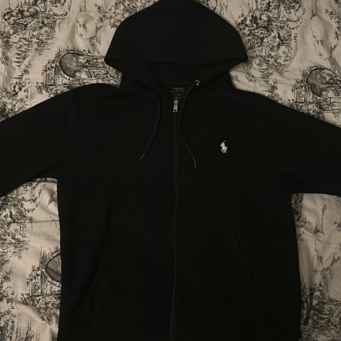 Säljer en klassisk svart hoodie från Ralph Lauren med dragkedja och den ikoniska loggan på bröstet. Perfekt för en avslappnad stil. Den har en justerbar huva och fickor framtill.
