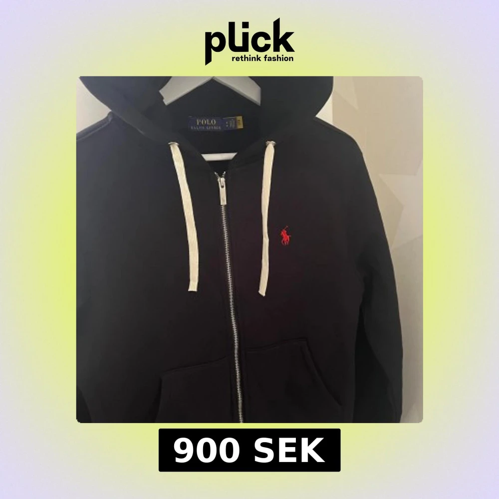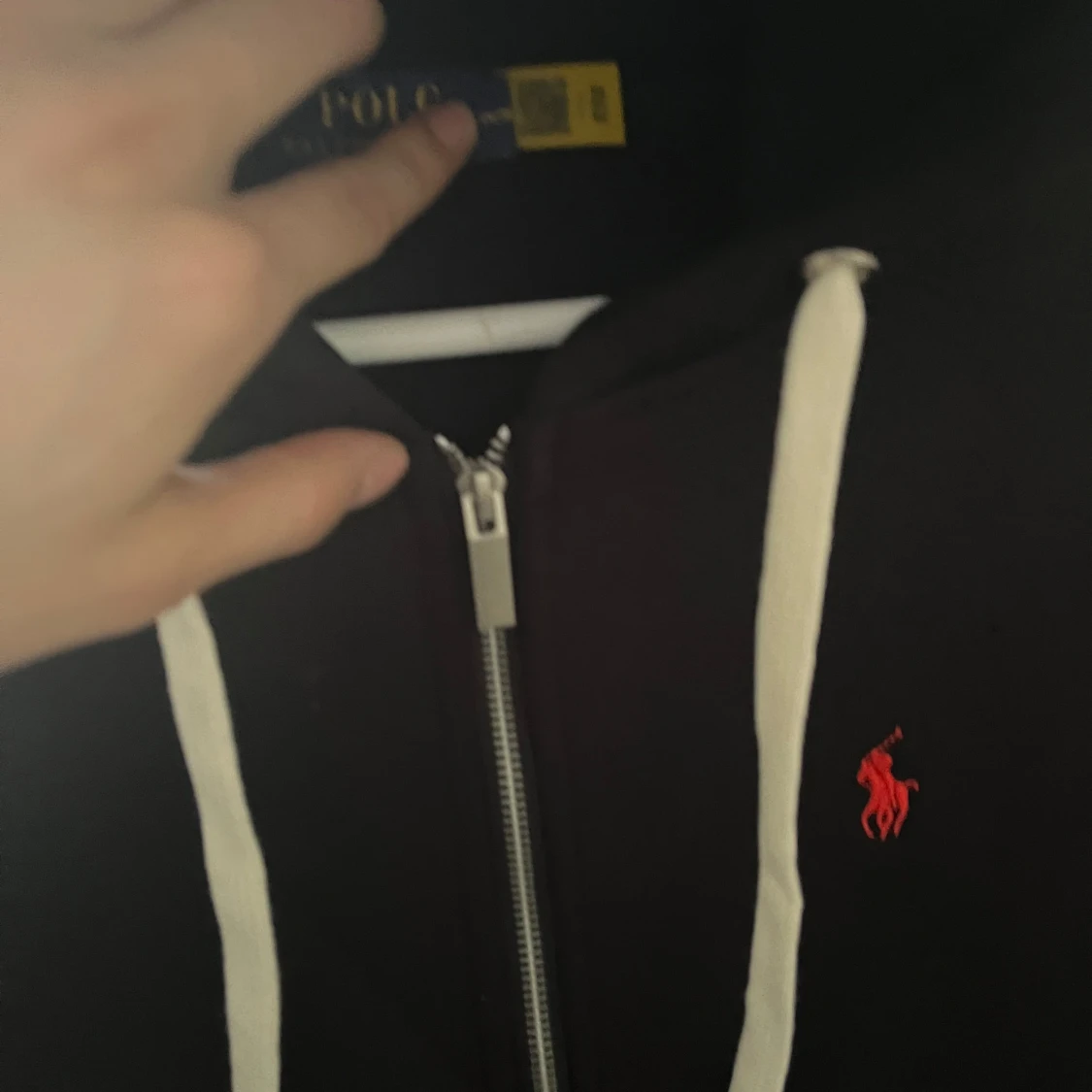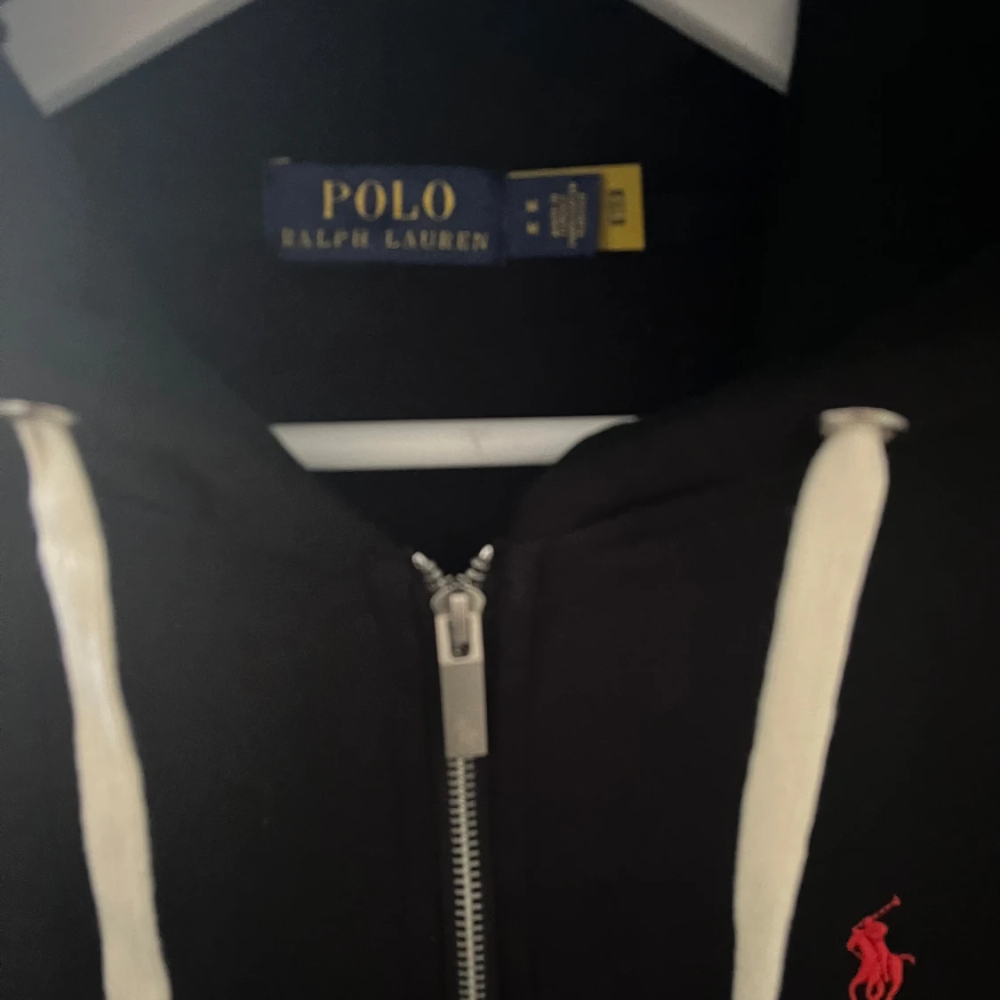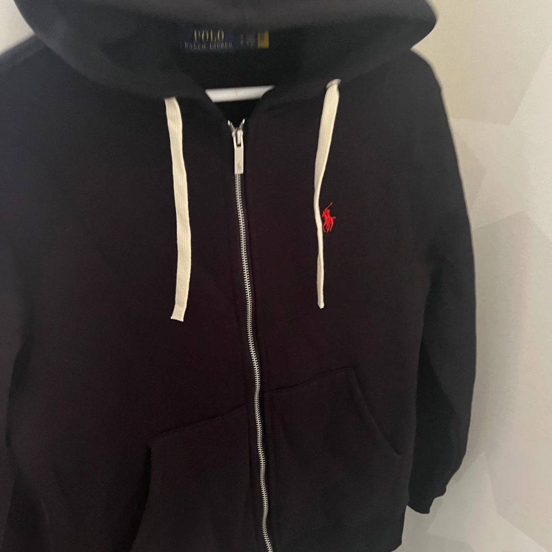 Säljer en stilren svart hoodie från Ralph Lauren med dragkedja och vit snörning i huvan. Den har en röd logotyp på bröstet och är perfekt för en avslappnad stil. Passar bra till både jeans och joggers.