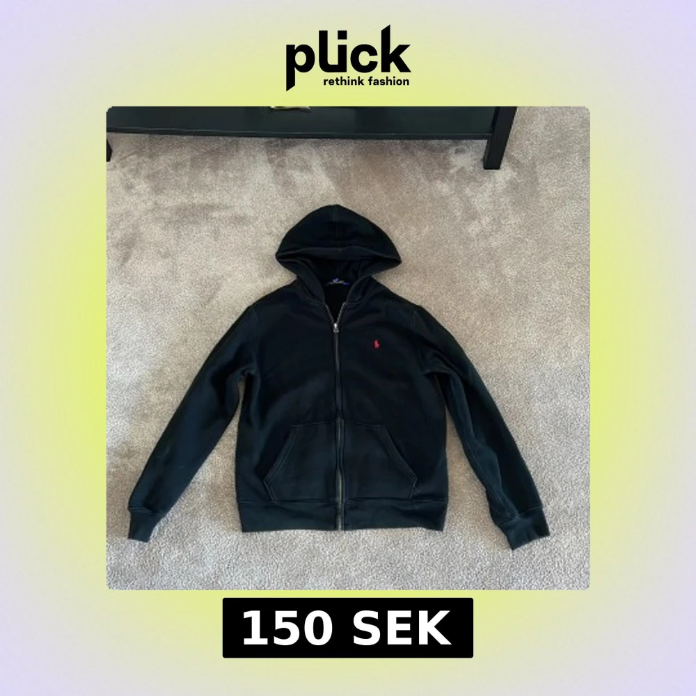 Svart hoodie från Ralph Lauren med dragkedja och klassisk huva. Tröjan har en röd broderad logga på bröstet och två stora fickor framtill.