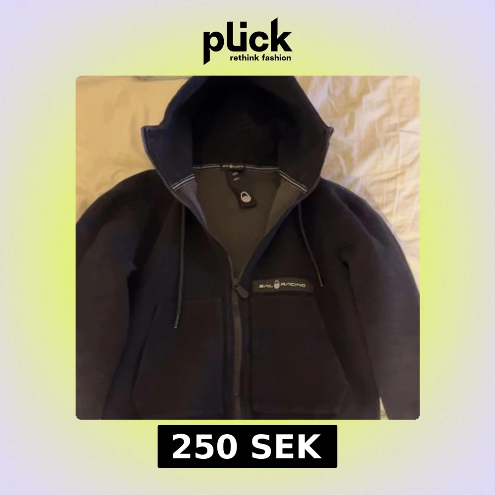 Säljer en svart hoodie från Sail Racing med dragkedja och huva. Jackan har två stora fickor framtill och justerbar dragsko i huvan. Perfekt för svala dagar och snygg logga på bröstet.