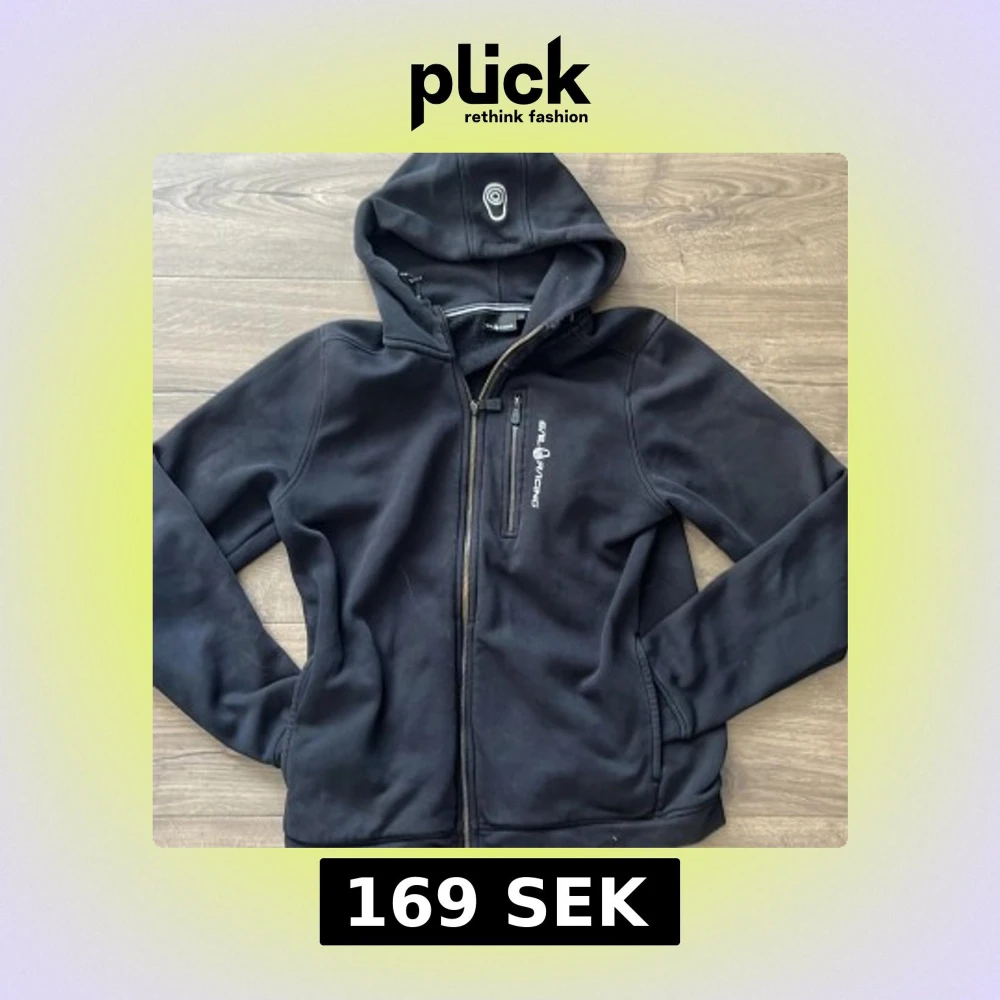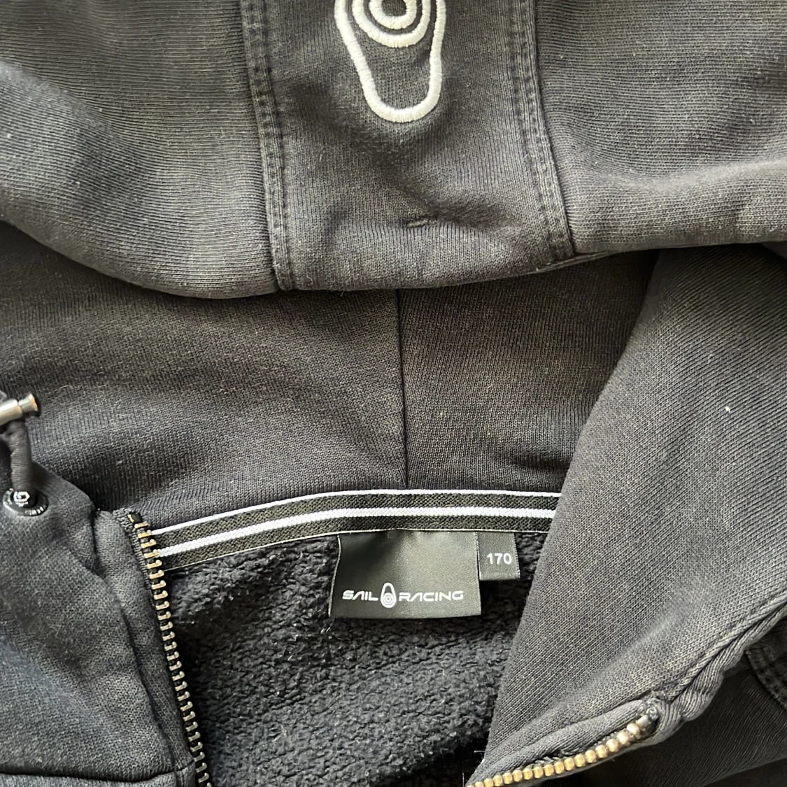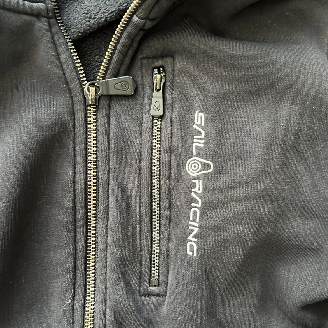 Svart hoodie från Sail Racing med broderad logga på bröstet och huvan. Tröjan har hel dragkedja framtill, bröstficka med dragkedja och mjukt fleecefoder på insidan. Perfekt för kyliga dagar och snygg till jeans eller träningsbyxor.