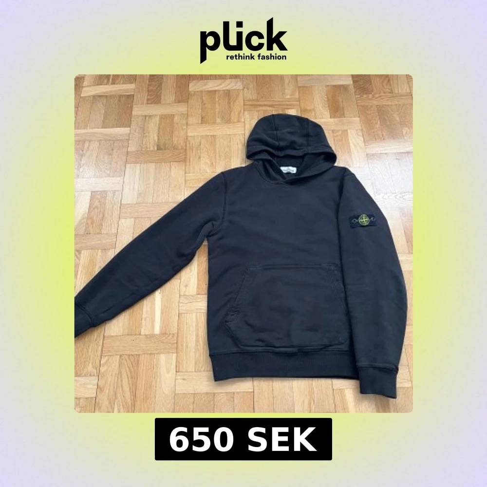 Säljer en svart hoodie från Stone Island i bra skick andvänd fåtal gånger, med klassisk design och känguruficka. Den har en huva och ett märke på ärmen. Perfekt för en stilren look. Stl 170/14 men passar som xs-s
