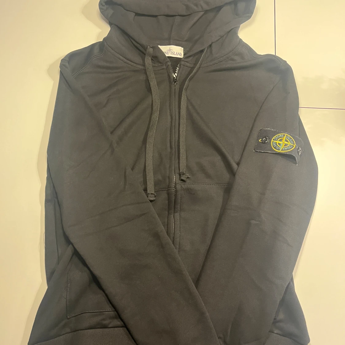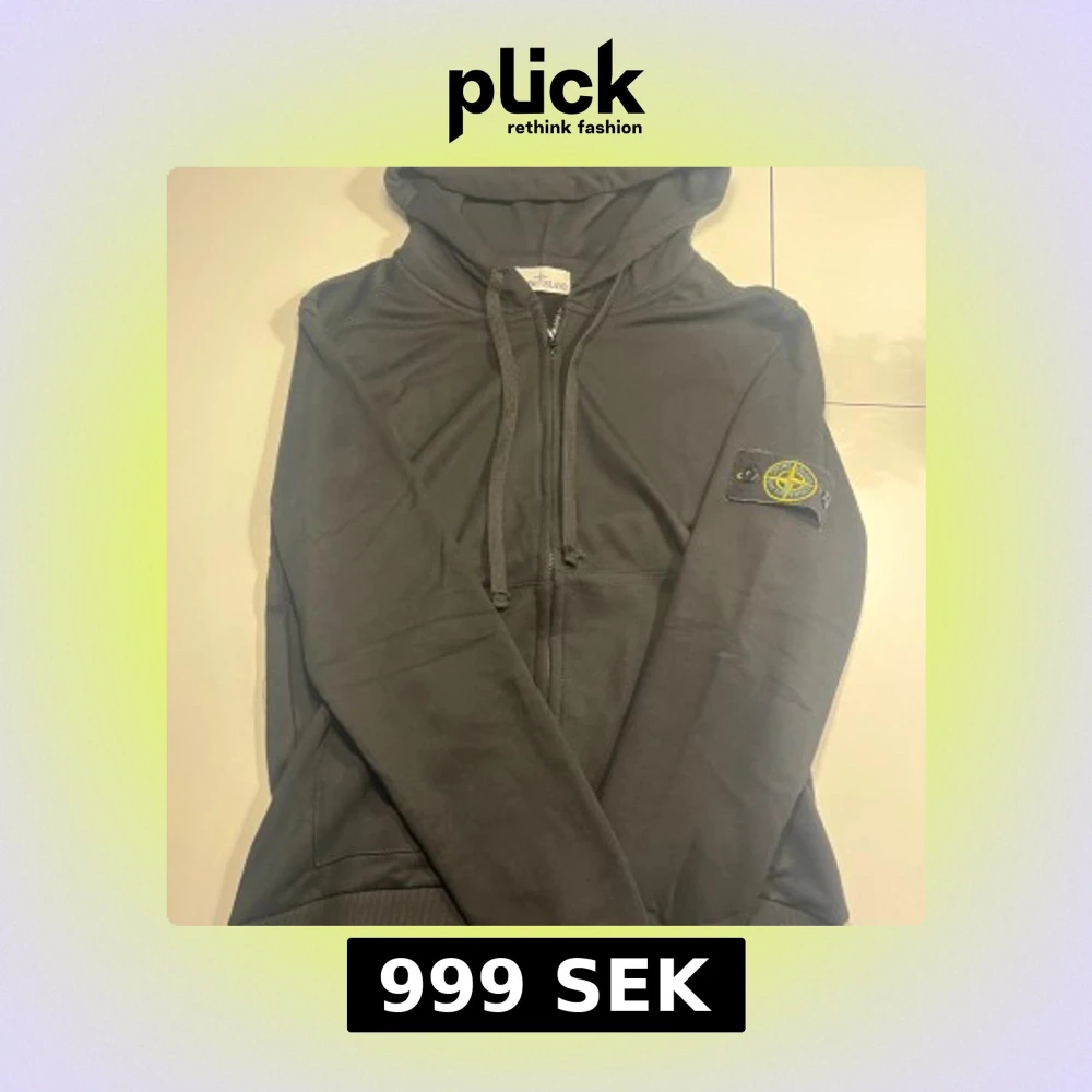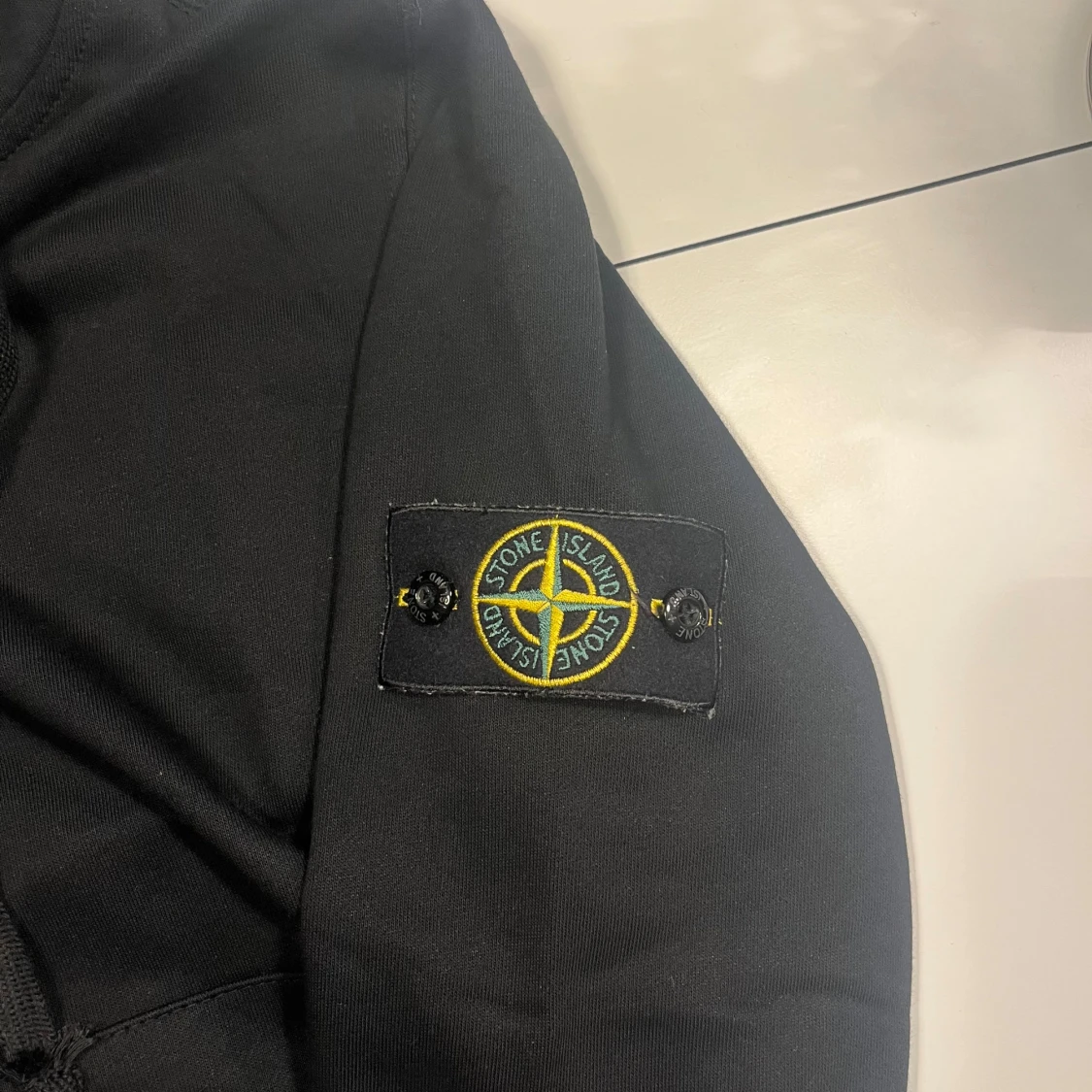 Svart hoodie från Stone Island med klassisk patch på vänster ärm. Tröjan har huva med snörning, dragkedja framtill och ribbade muddar. Materialet är mjuk bomull som känns skön mot huden. Perfekt för dig som gillar streetwear och vill ha en clean look. Hör av dig vid minsta fundering!