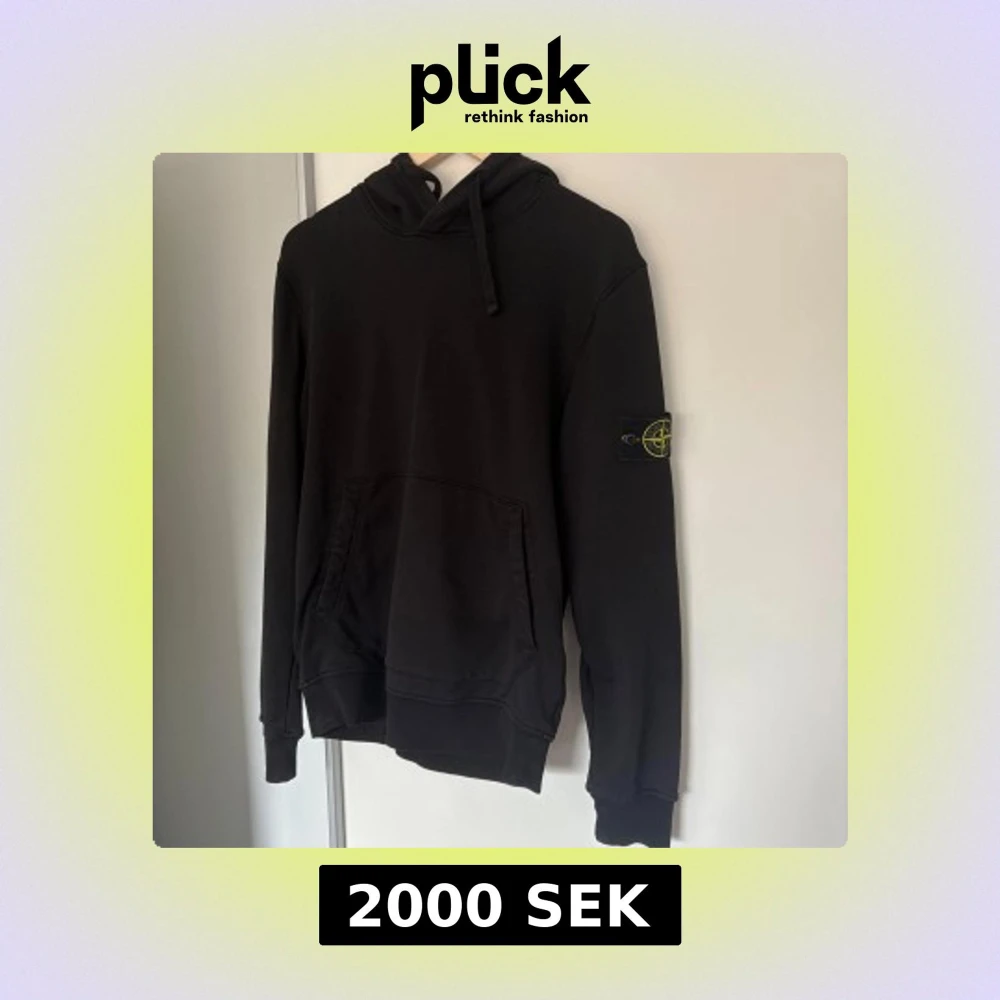 Svart hoodie från Stone Island med klassisk patch på vänster ärm. Tröjan har huva med snörning, magficka och ribbade muddar. Inköpt på Nk för 3500kr. Har tyvärr inte kvitto men går att legit checka via certi logo. Har inte tvättats mer än 4 gånger så suveränt skick!