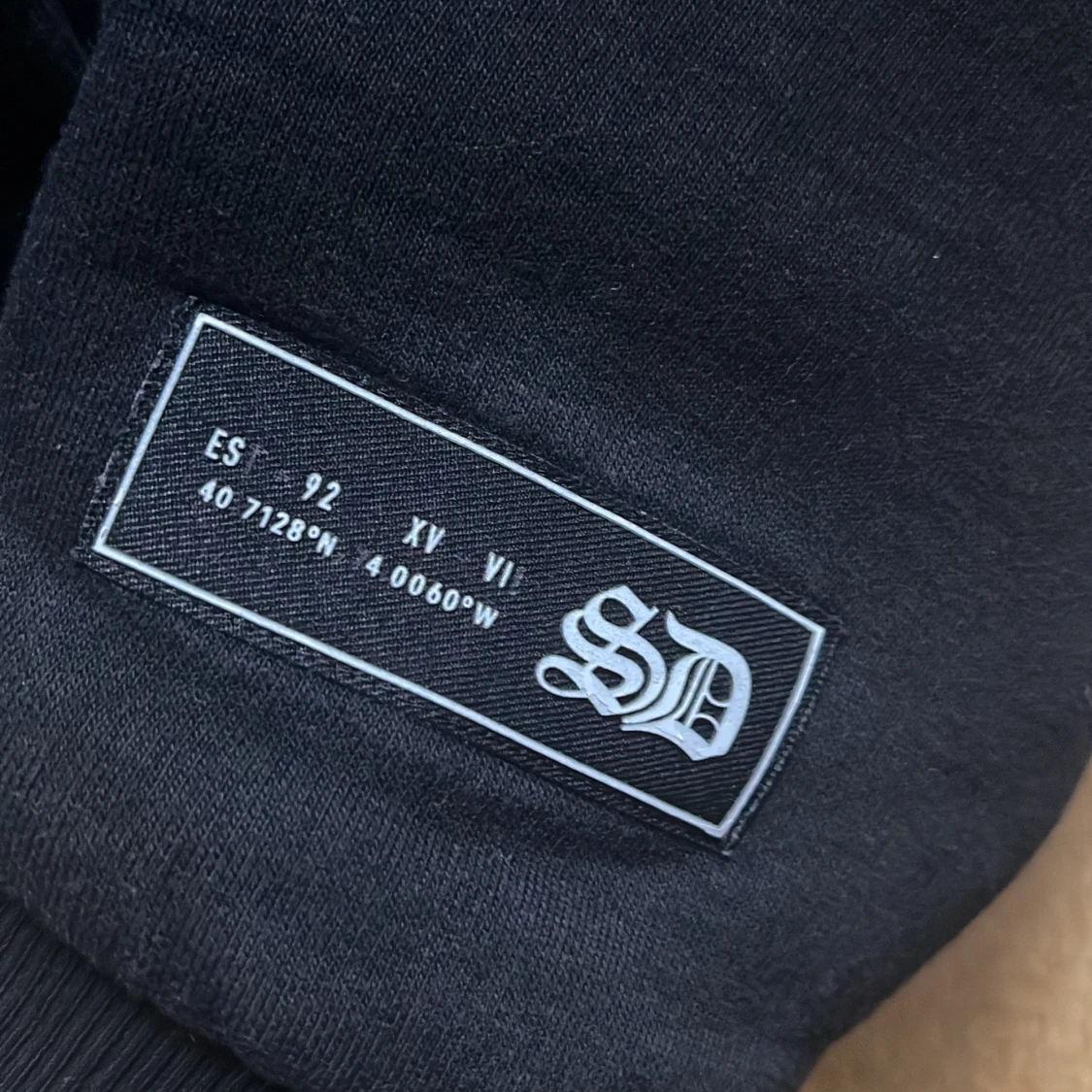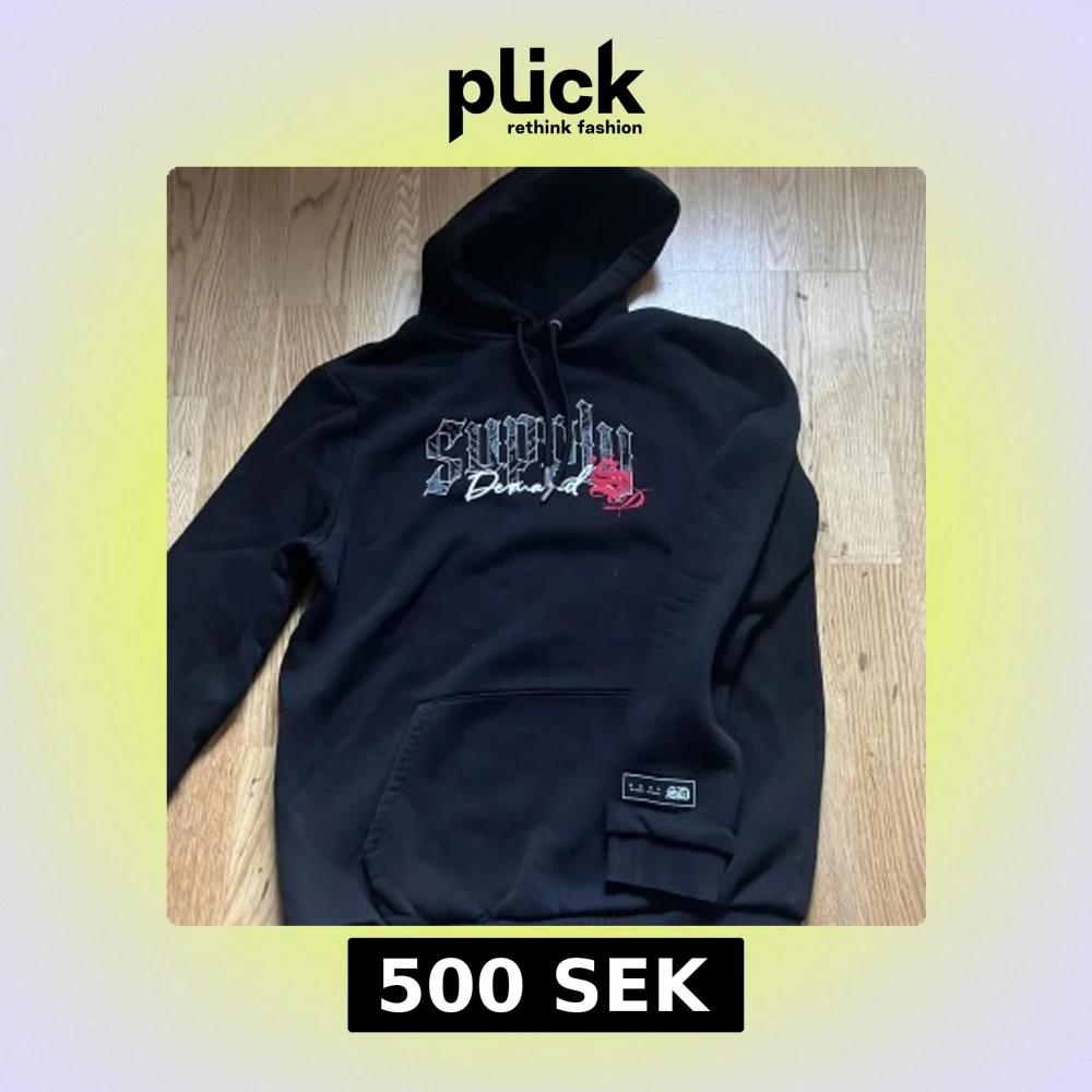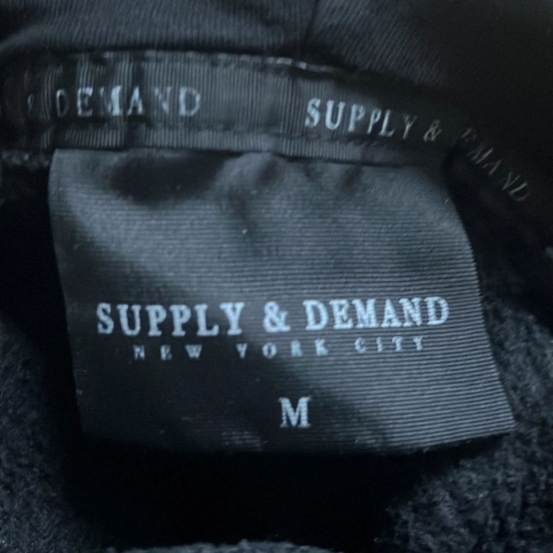Säljer en svart hoodie från Supply & Demand med tryck på framsidan. Hoodien har en klassisk design med känguruficka och justerbar huva. Perfekt för en avslappnad stil.