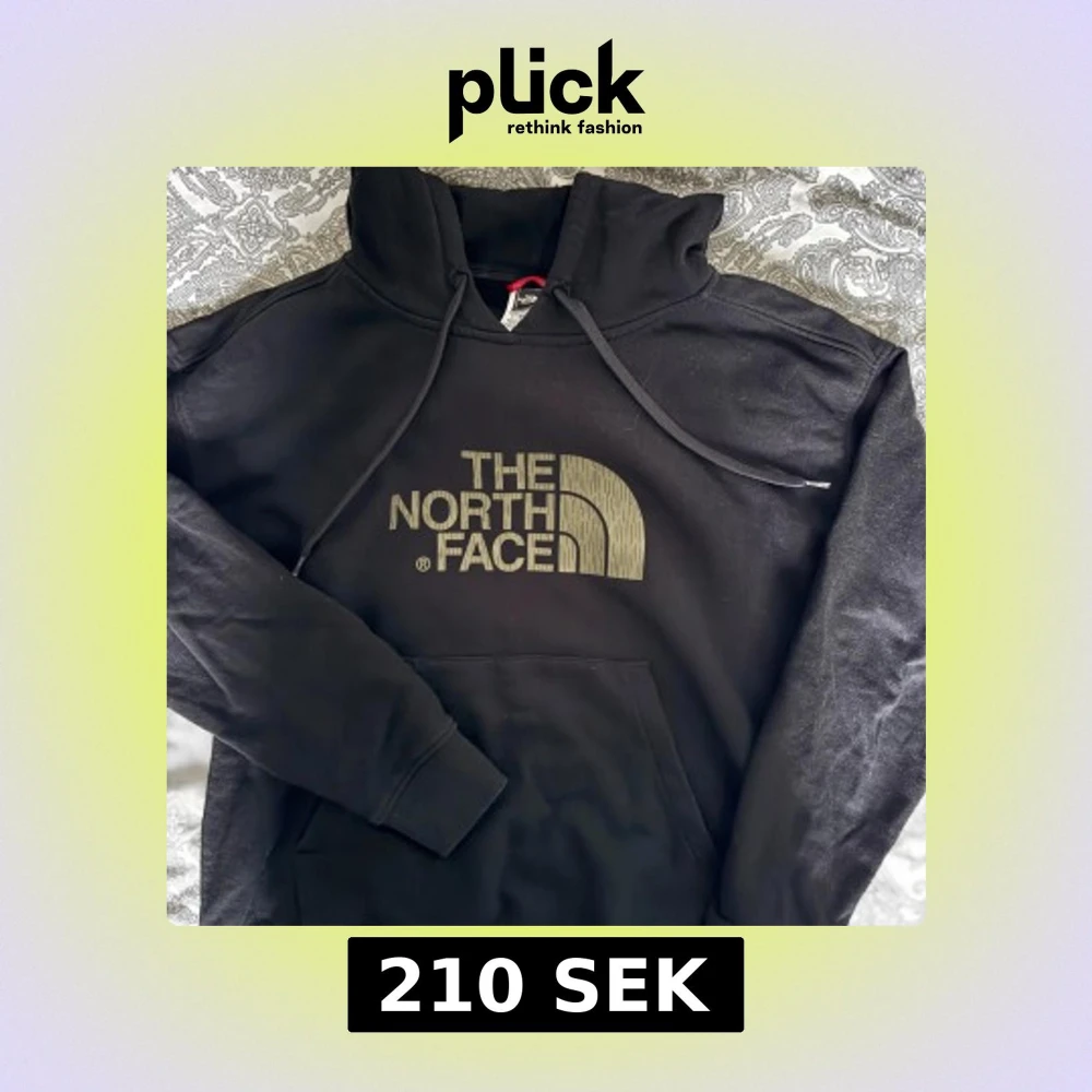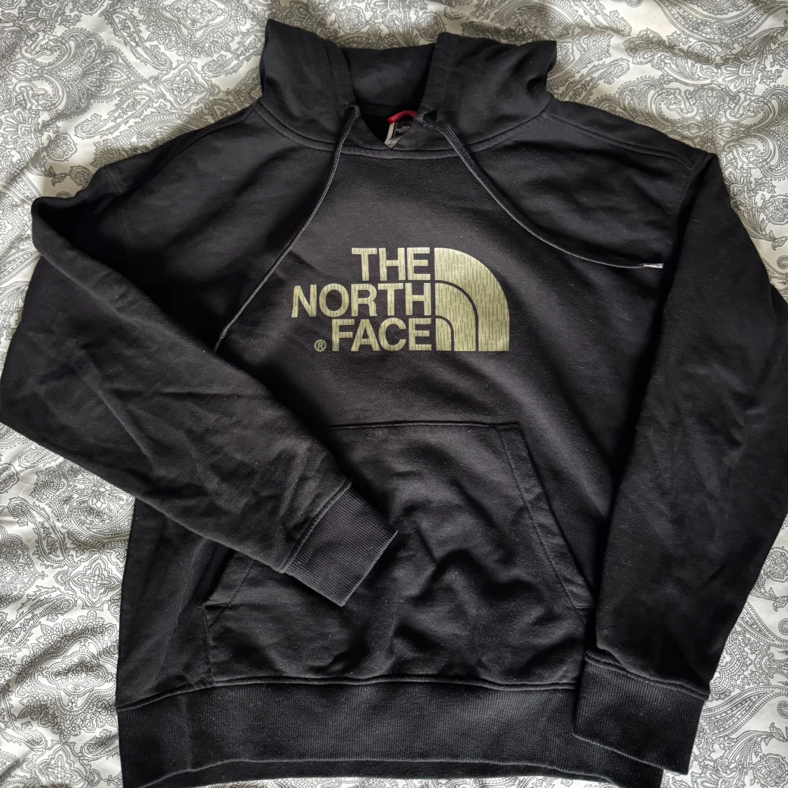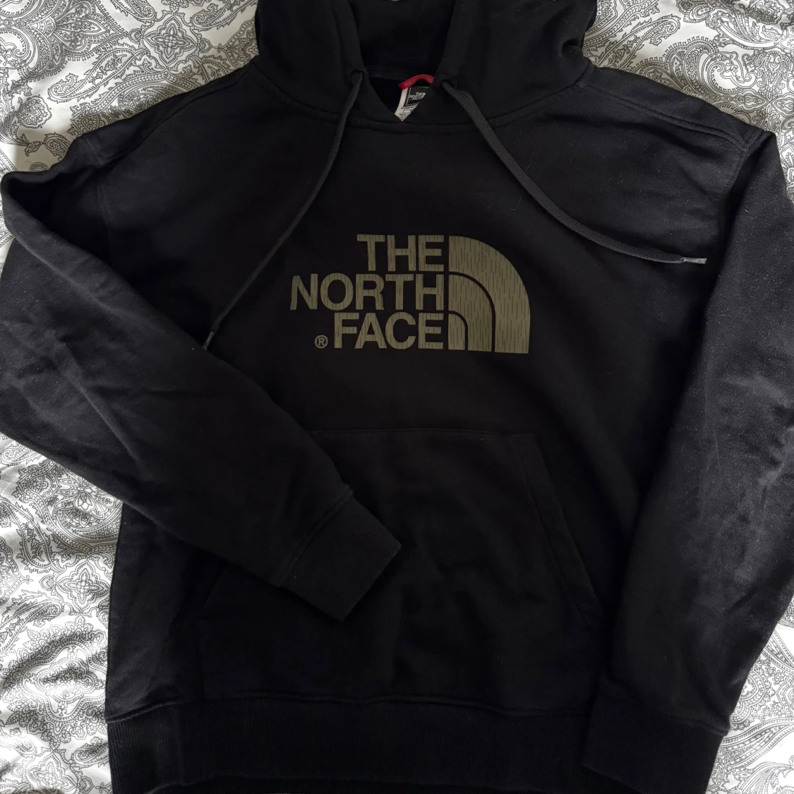 Svart hoodie från The North Face med stor logga i beige framtill. Klassisk känguruficka och ribbade muddar. Perfekt för chill dagar eller när du vill ha en clean streetstyle-look.