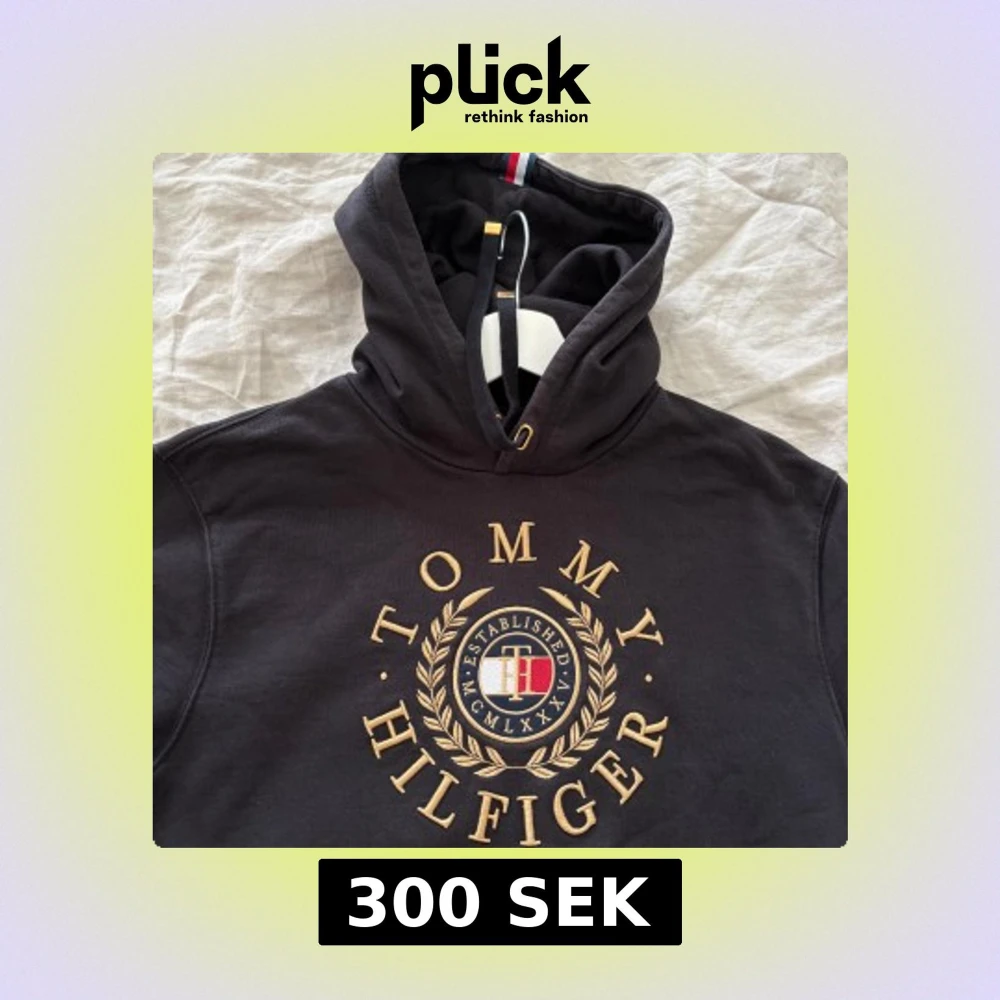 Svart hoodie med stor broderad Tommy Hilfiger-logga och gulddetaljer framtill. Klassisk huva med snörning och magficka. Perfekt för en avslappnad stil. Passar både storlek M och L