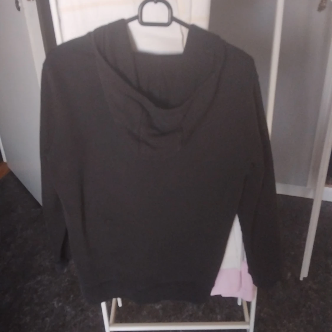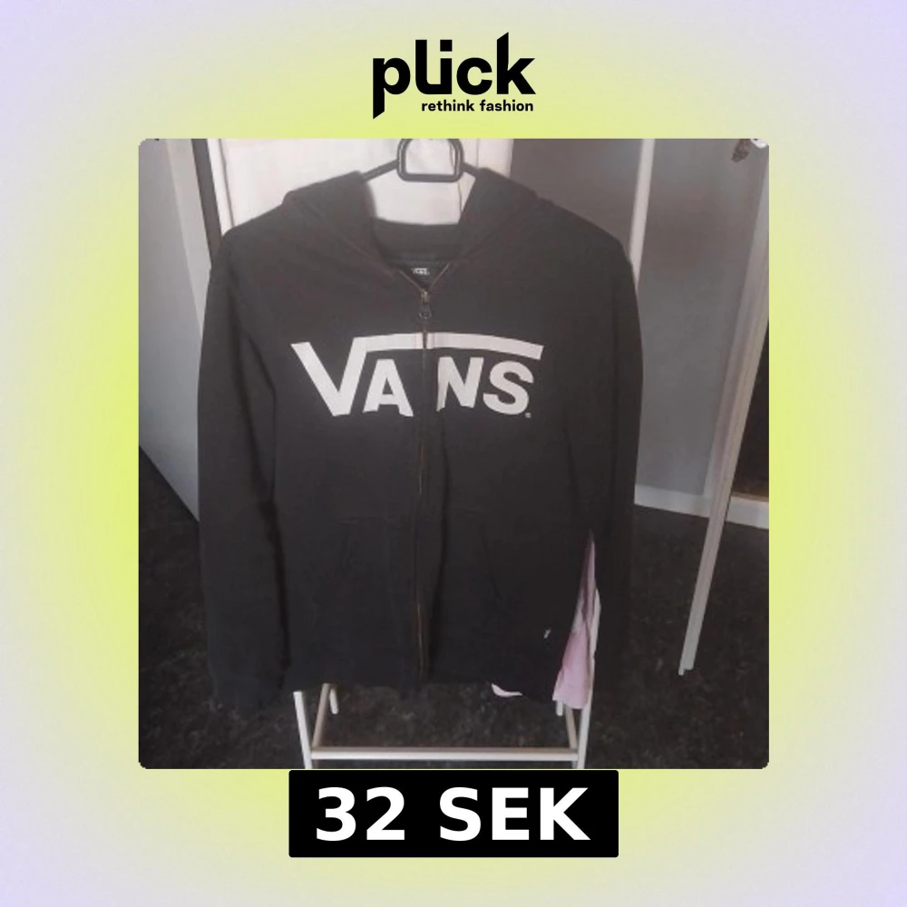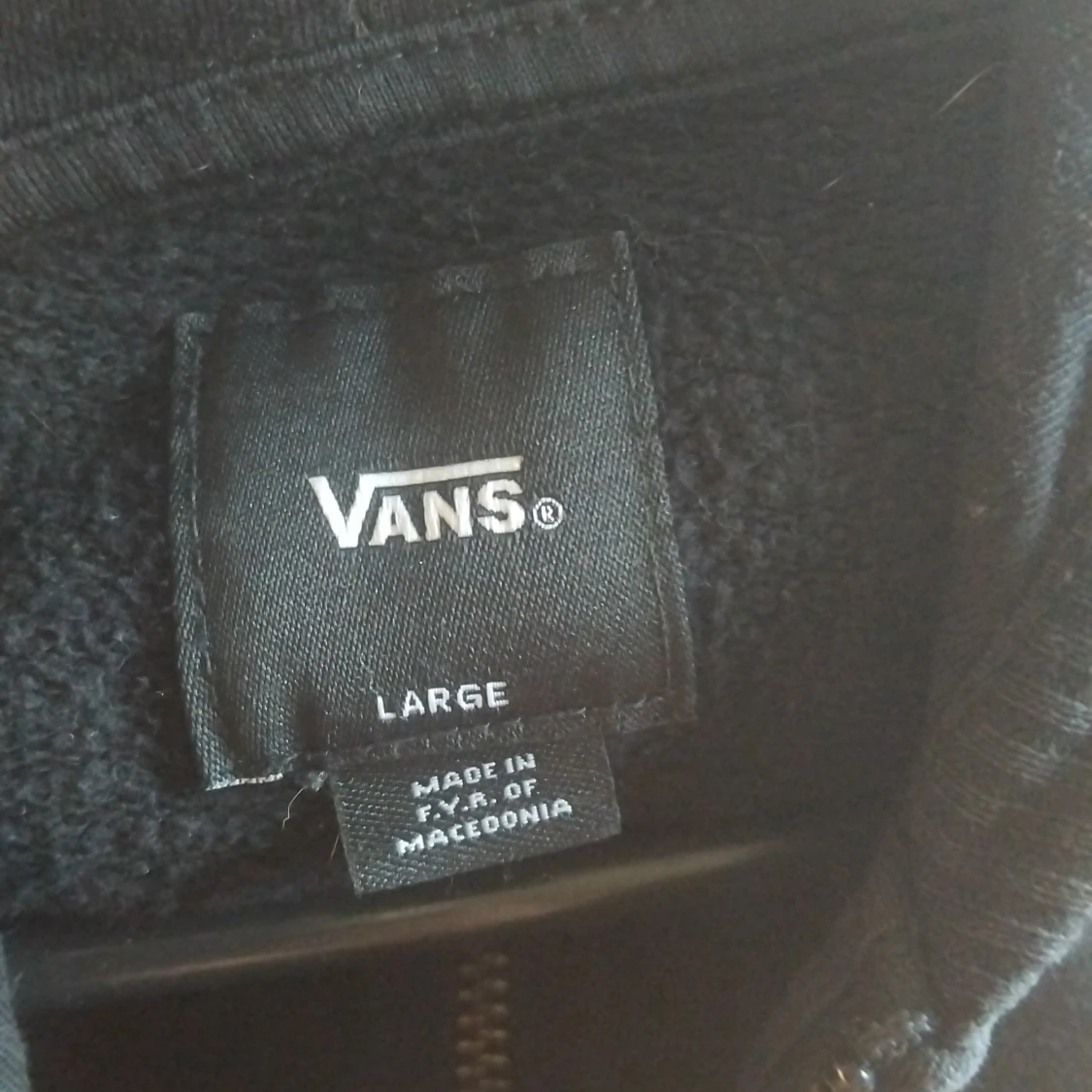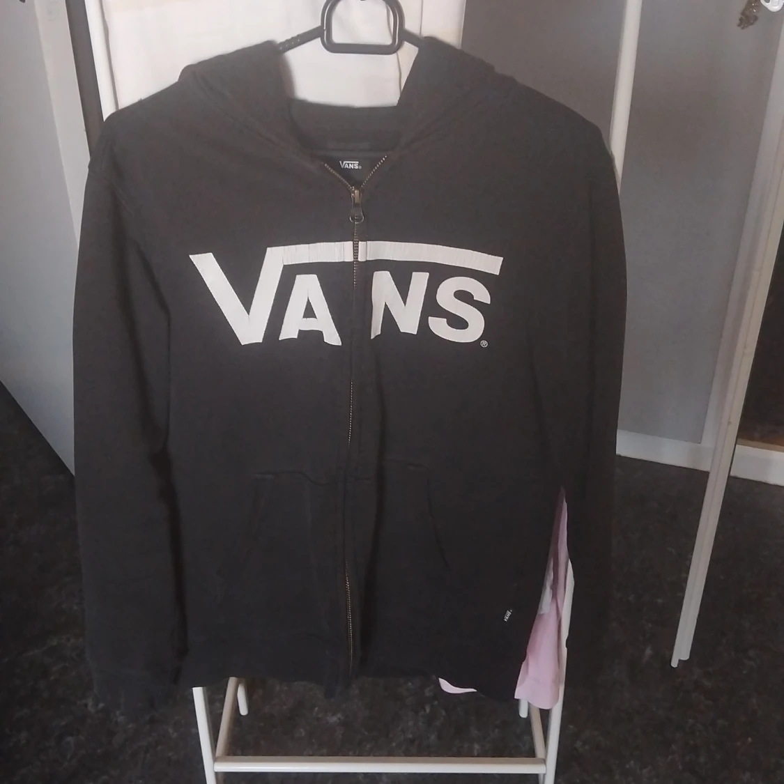 Svart hoodie från Vans i storlek L med stor vit logga framtill. Tröjan har huva, dragkedja och två fickor på magen. Perfekt för en avslappnad streetstil och funkar året runt. Materialet är mjukt och skönt, troligen bomullsmix.