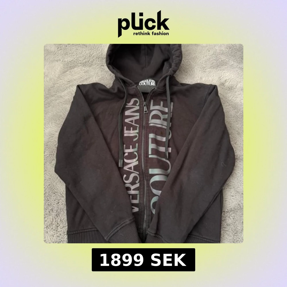 Säljer en svart hoodie från Versace Jeans Couture med stor logga framtill. Den har dragkedja och huva, perfekt för en casual look. Ribbstickade muddar vid ärmslut och nederkant ger en skön passform.