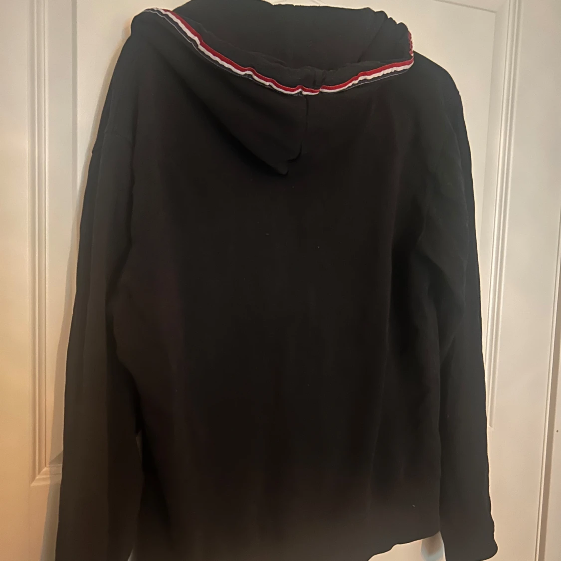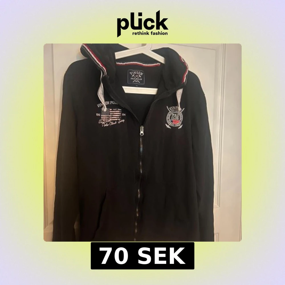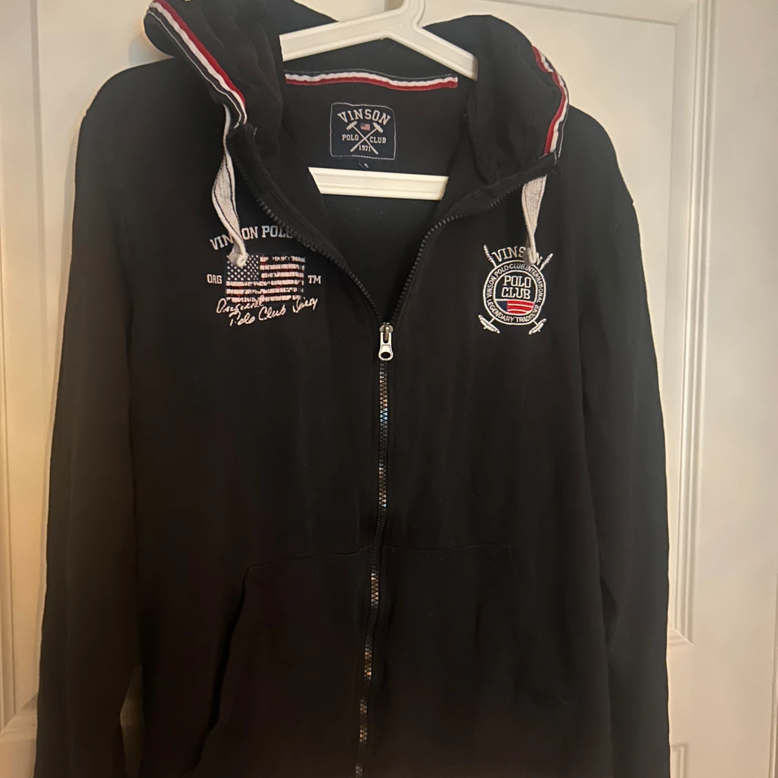 Svart hoodie från Vinson Polo Club med broderade detaljer och amerikansk flagga på bröstet. Tröjan har hel dragkedja, huva med vit snörning och röd-vita ränder längs kanten. Perfekt för en sportig och avslappnad stil.