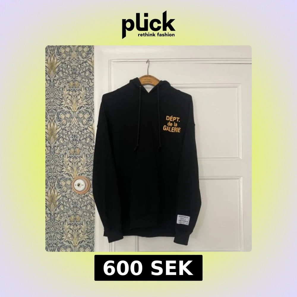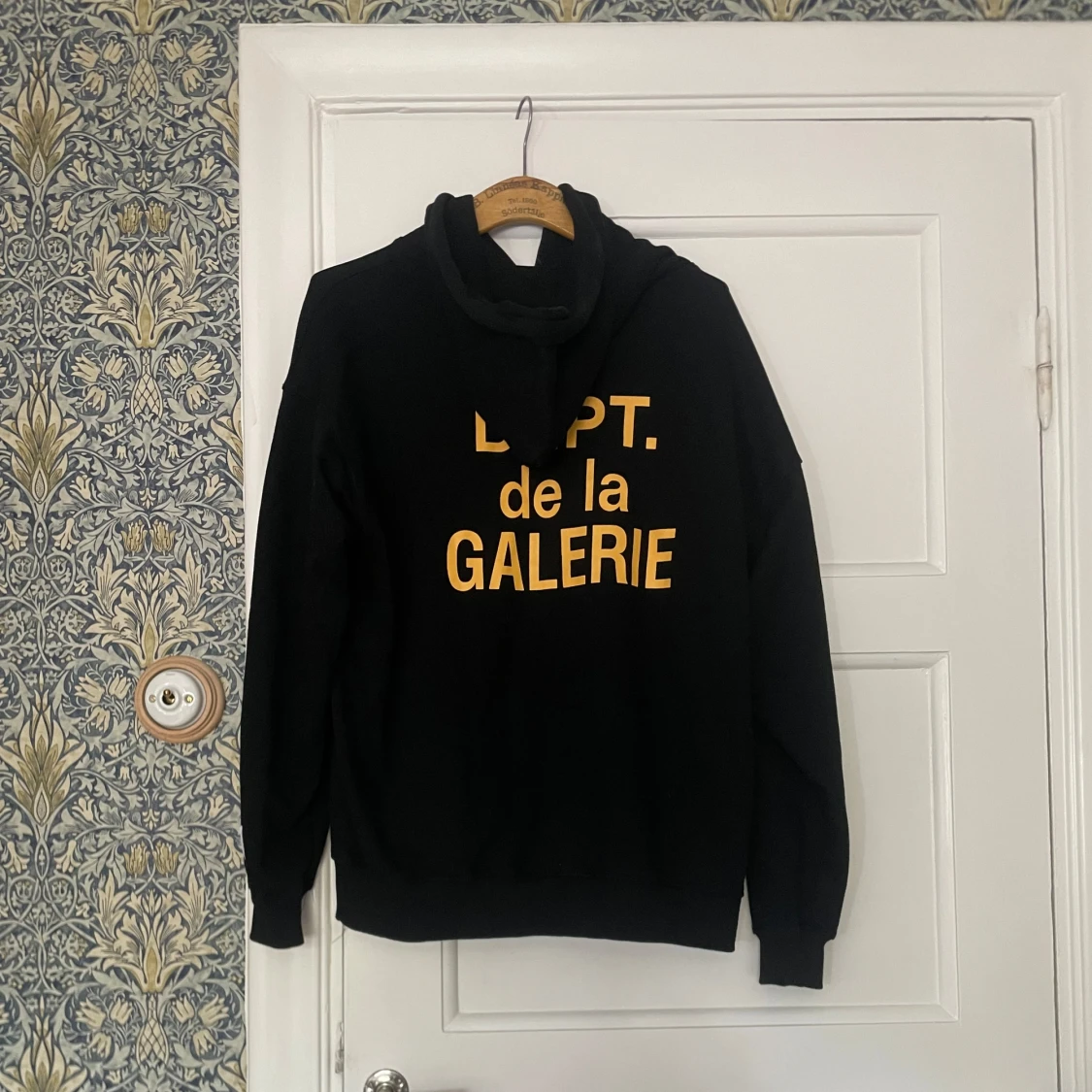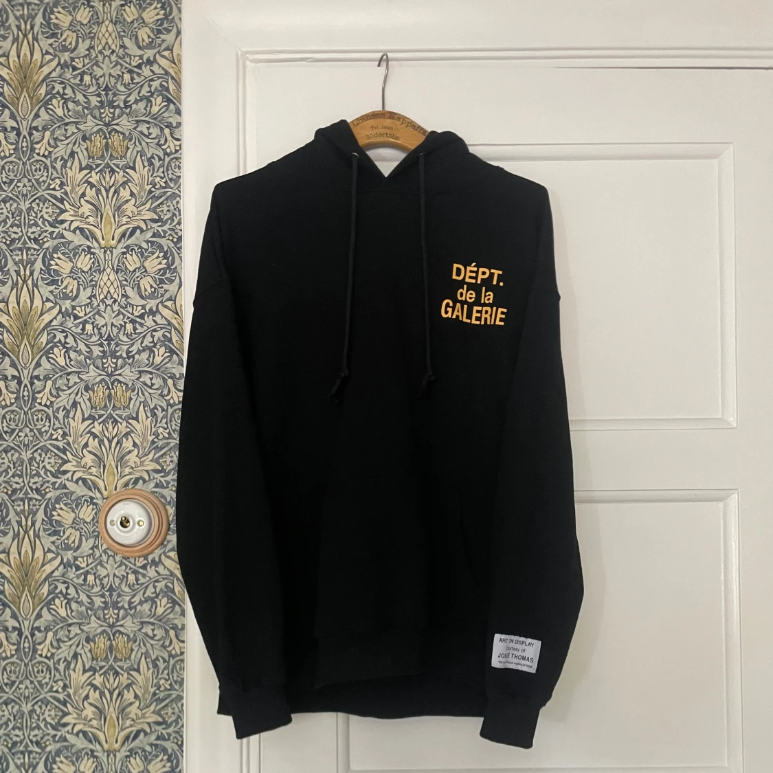Svart hoodie från DEPT de la GALERIE med gul texttryck både fram och bak. Knappt använd eftersom den är för stor på mig, M men sitter som L
