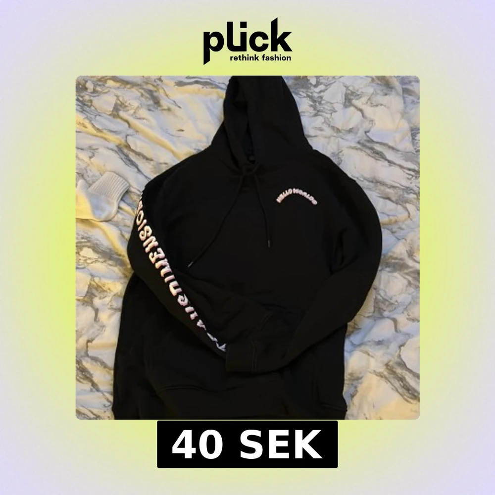 Svart hoodie från H&M i storlek S med coolt tryck 'Hello Worlds' i rosa och vitt på bröstet, ryggen och ena ärmen. Tröjan har huva med snörning och regular fit. Materialet är mjuk bomull och polyester, perfekt för dig som gillar streetwear och grafiska prints.