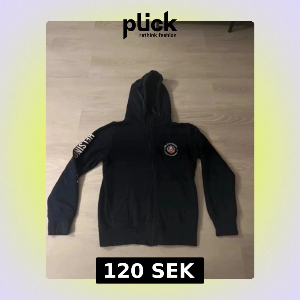 Svart hoodie med dragkedja och huva från Helsingborgs IF. Långärmad med vit text 'HELSINGBORGS' längs ena ärmen och klubbmärke på bröstet. Skön och sportig stil, perfekt för dig som gillar fotboll och vill visa ditt lag.saknar ”f” på armen