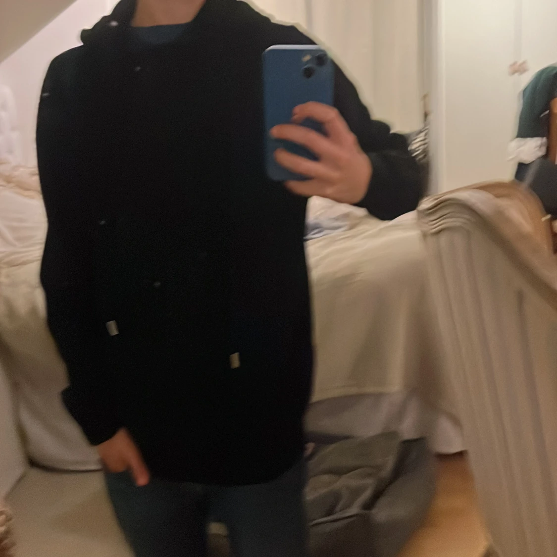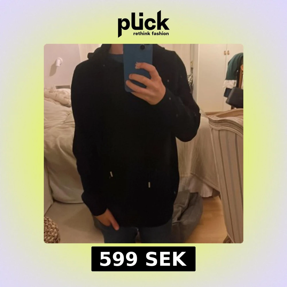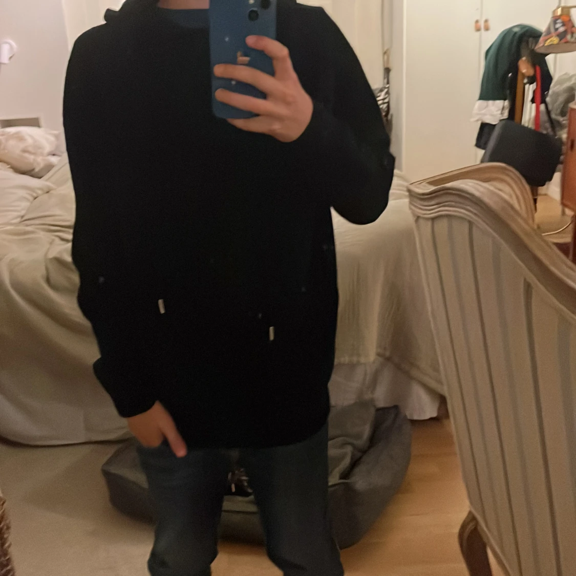 Svart hoodie med klassisk huva och snörning framtill. Tröjan har långärmad design och en loose passform som ger en chill vibe. Perfekt för att slänga på sig när det är lite kyligt ute. Enkel och stilren utan synliga loggor eller mönster.