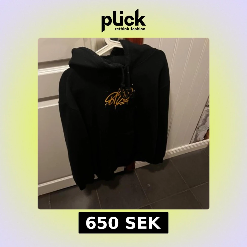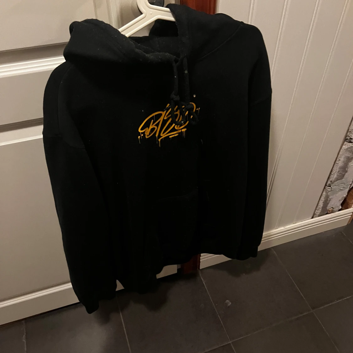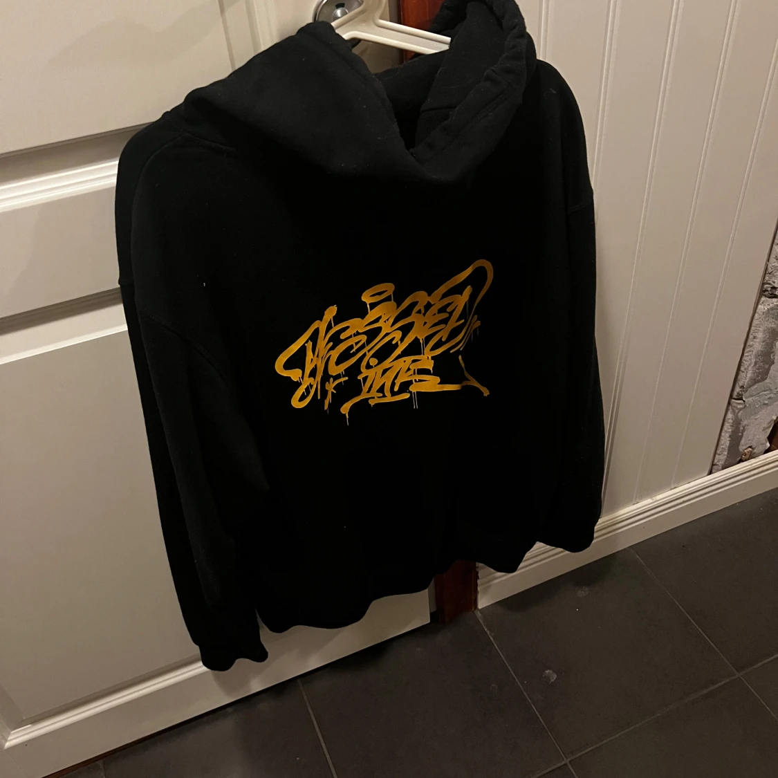 Säljer en svart hoodie med gul text märkt Blessed ink limiterad tröja så att går inte att få tag på
