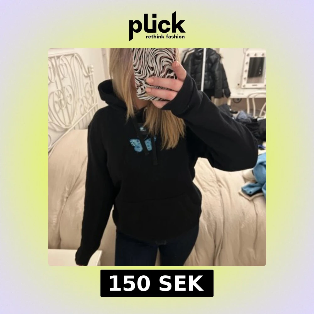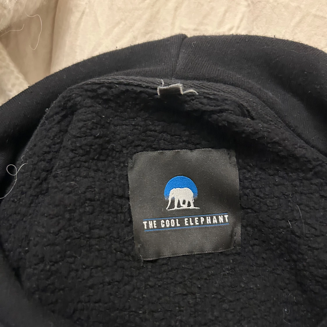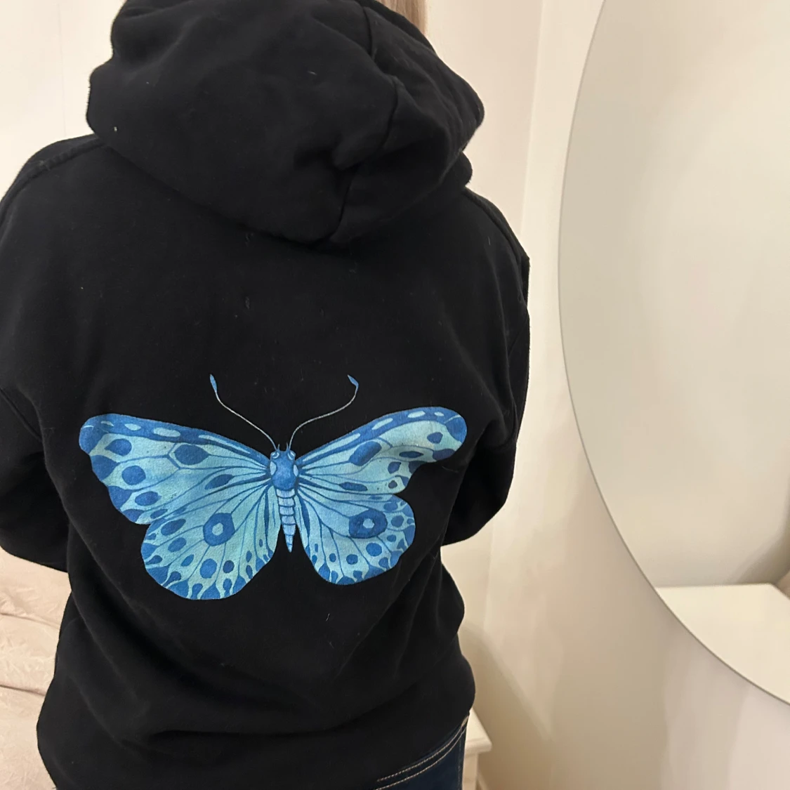 Säljer en svart hoodie från The Cool Elephant med en stor blå fjäril på ryggen och en mindre på framsidan. Hoodien har långa ärmar och en mysig huva. Perfekt för en avslappnad stil.