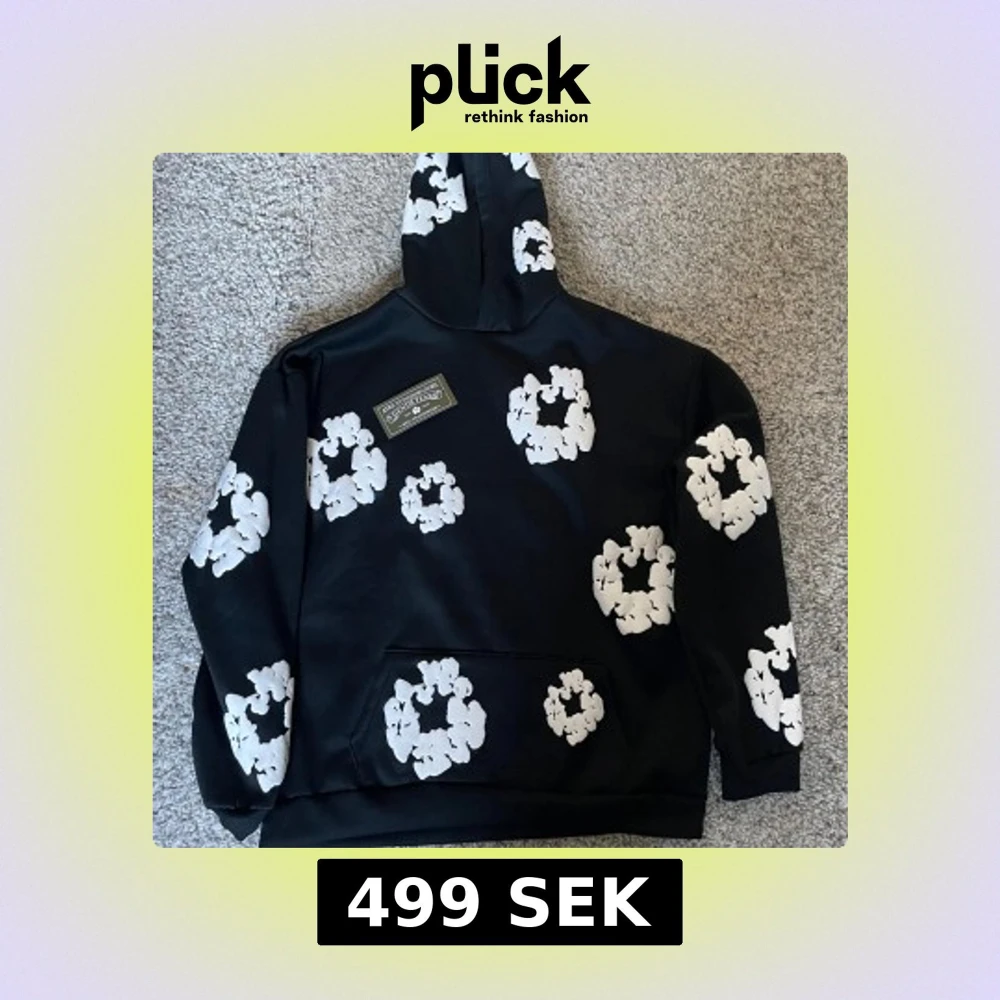 Säljer en svart hoodie med ett unikt vitt blommönster. Hoodien har en klassisk design med en stor ficka framtill och en bekväm huva. Perfekt för en stilren och avslappnad look. Storleken är L. Lite sämre kvalite och därav lågt pris. Hålen till fickan är är små.