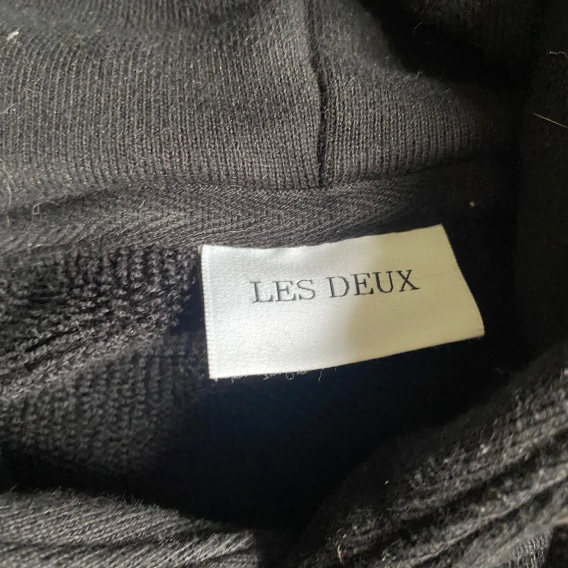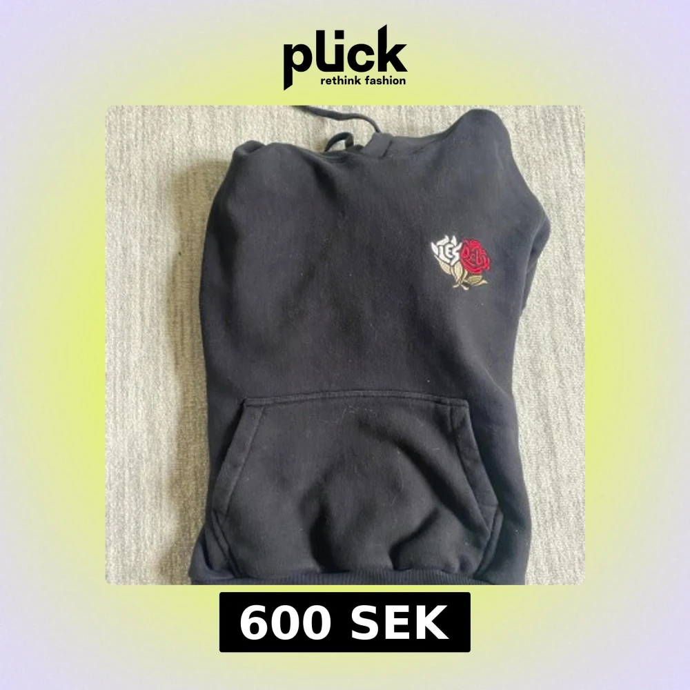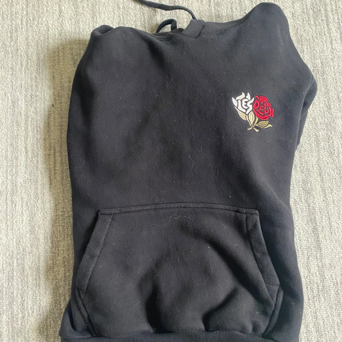 Svart hoodie från Les Deux med broderad röd och vit ros på bröstet. Tröjan har huva och en stor magficka framtill. Perfekt för en avslappnad och stilren look.