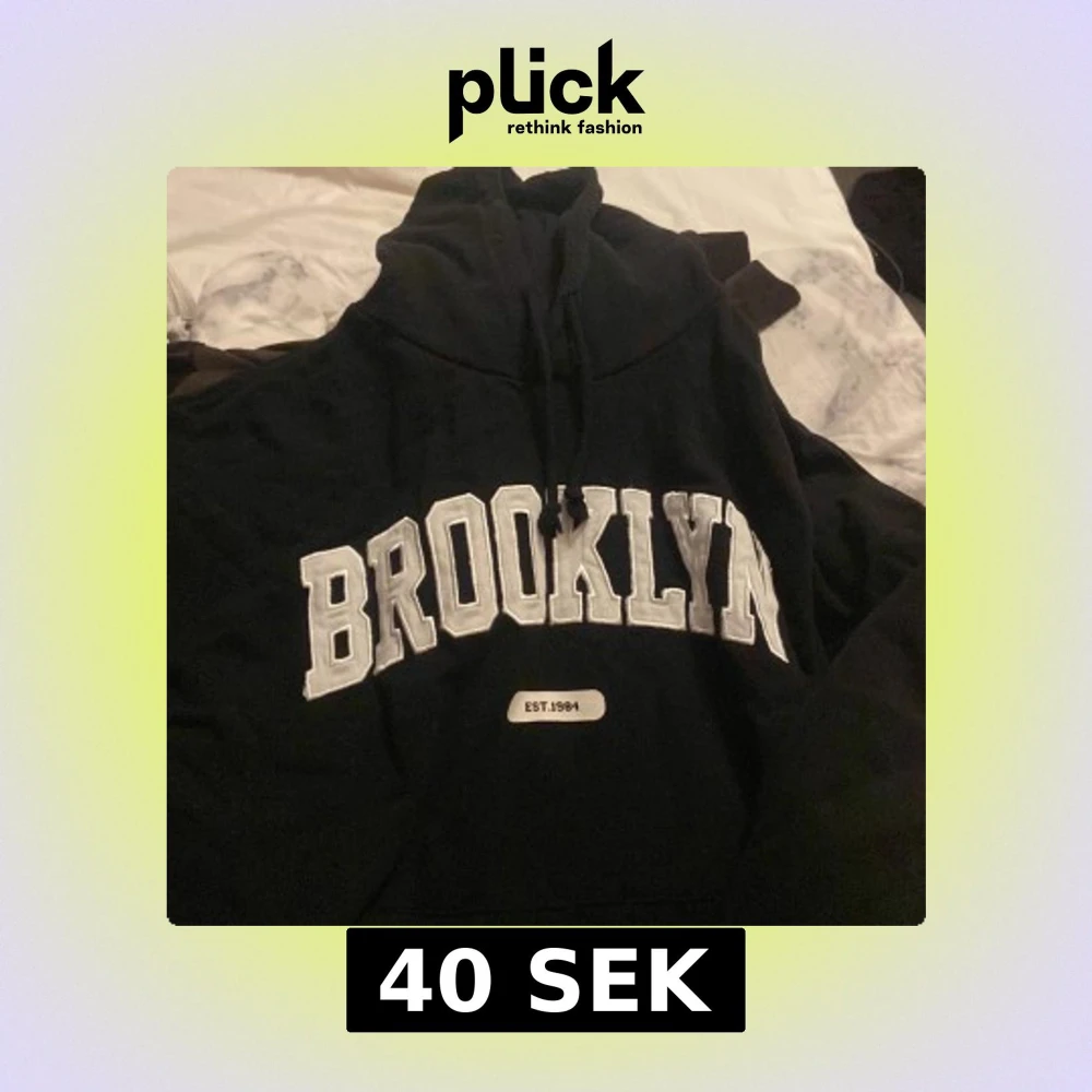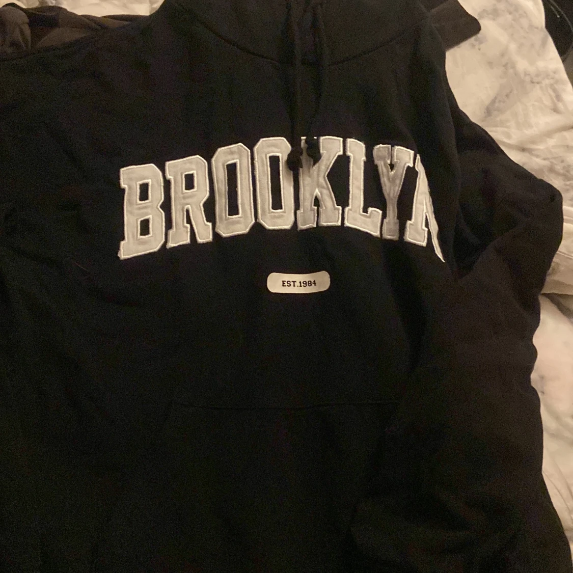 Svart hoodie med stor vit BROOKLYN-text framtill och snörning i luvan