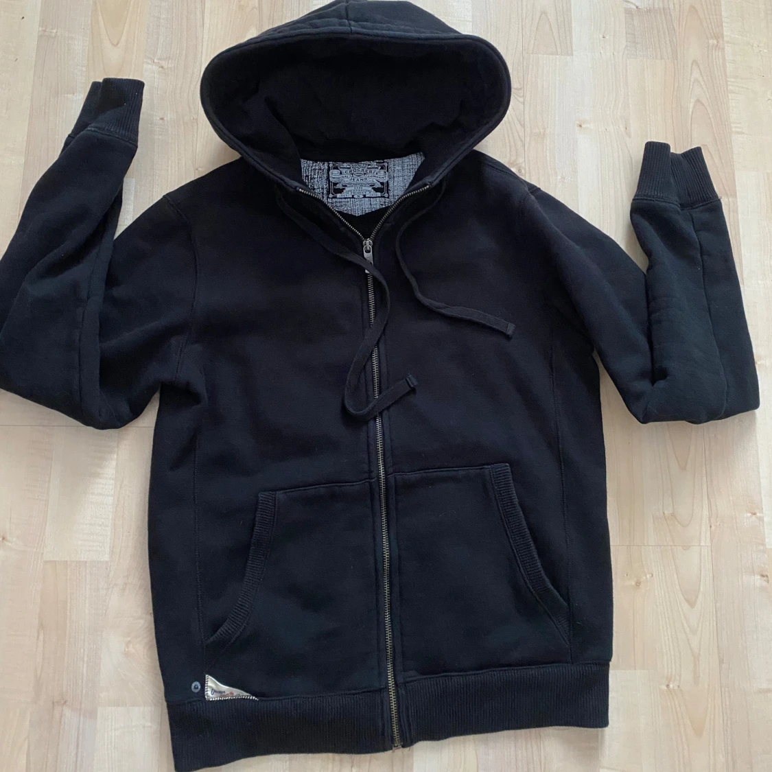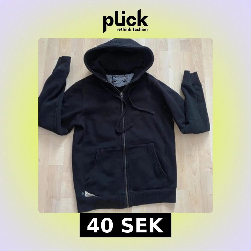Säljer en klassisk svart hoodie med dragkedja och huva. Tröjan har långa ärmar och praktiska fickor framtill. Perfekt för en avslappnad stil.