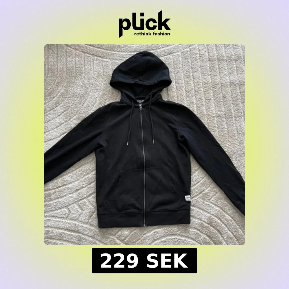 Säljer en stilren svart hoodie med dragkedja och justerbar huva. Tröjan har långa ärmar och praktiska fickor framtill. Perfekt för en avslappnad look.