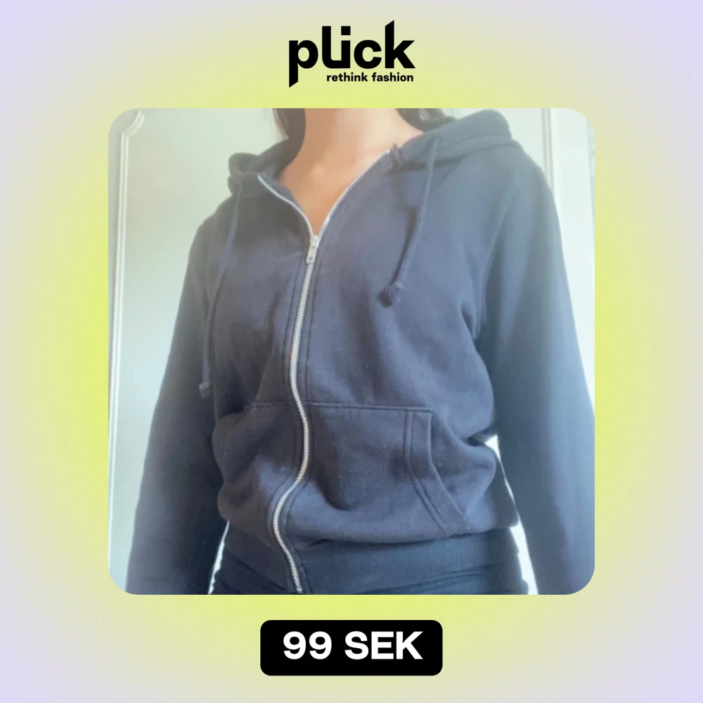 En bekväm svart hoodie med dragkedja framtill. Hoodien har en justerbar huva och en stor ficka på magen. Den är långärmad och har ribbade muddar vid ärmslut och nederkant.