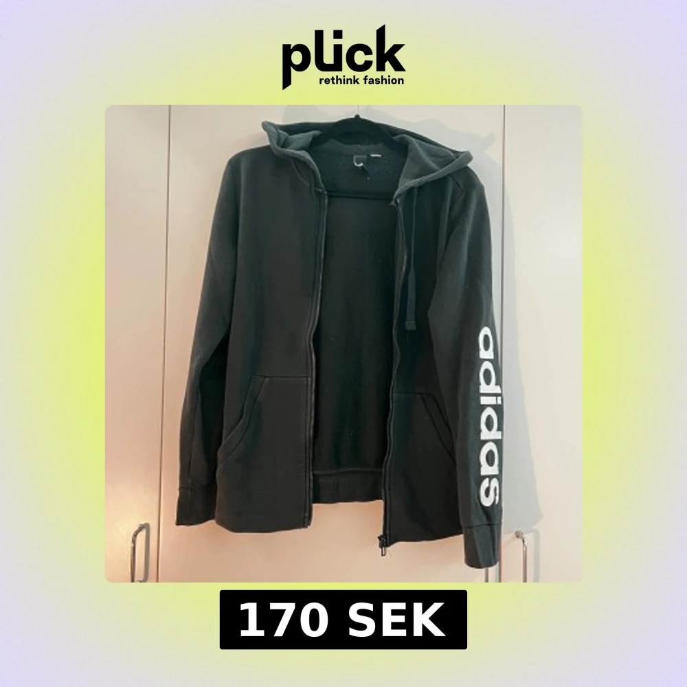 Svart hoodie från Adidas med vit logga längs ena ärmen och liten logotyp på ryggen. Tröjan har huva, dragkedja och två fickor framtill. Perfekt för en sportig och avslappnad stil. Storleken är 38. Priset kan diskuteras.